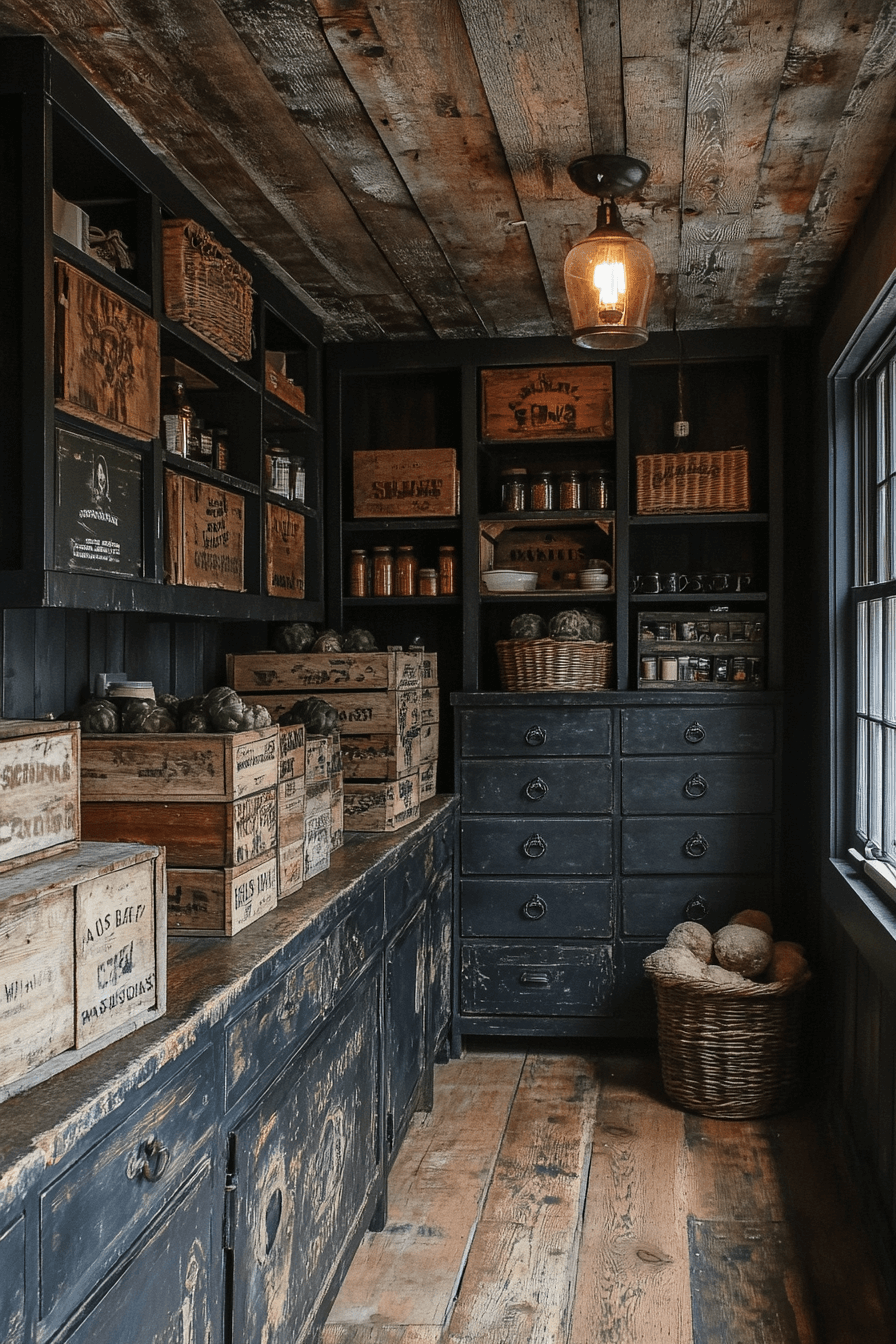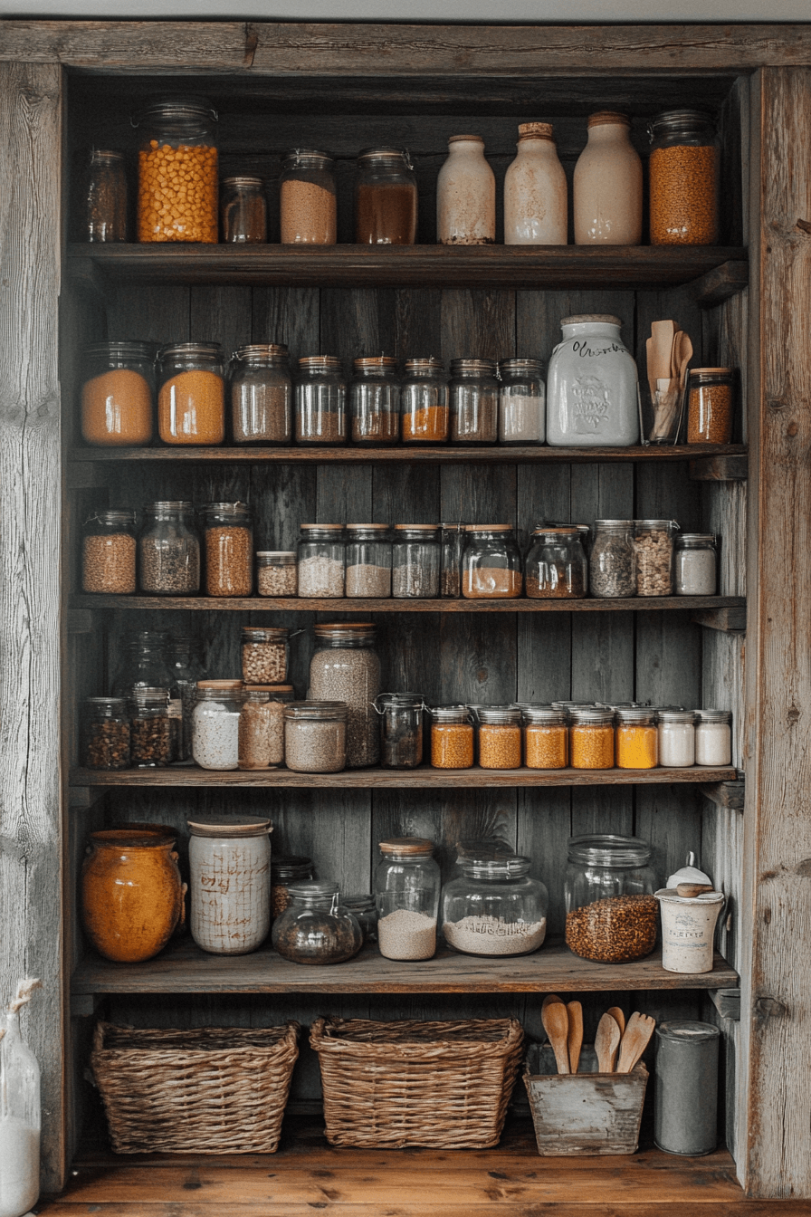 A pantry styled with vintage jars, wooden crates, and faded labels brings homely nostalgia to life. It’s one of those antique farmhouse decor ideas that instantly connect comfort and heritage. Each shelf tells stories of old recipes and family gatherings. The aged wood and simple organization radiate warmth.