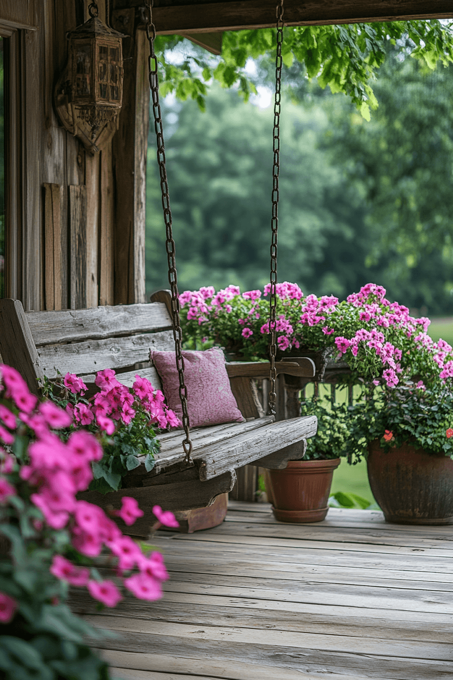 A wooden porch swing captures the slow rhythm of country life perfectly. As one of the most joyful antique farmhouse decor ideas, it makes relaxation an art form. The soft creak of chains and worn paint feel warmly familiar. Mornings become moments to savor.