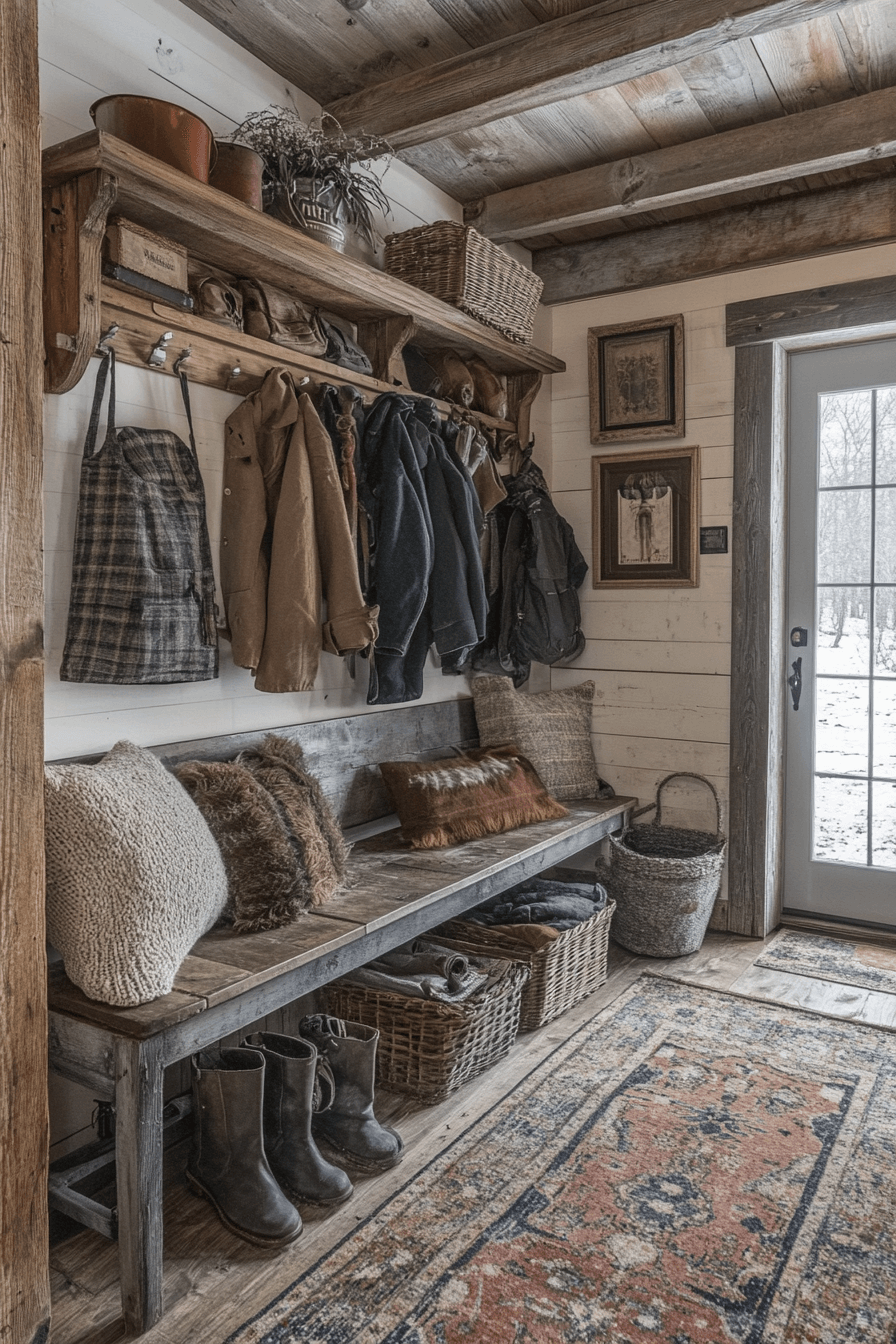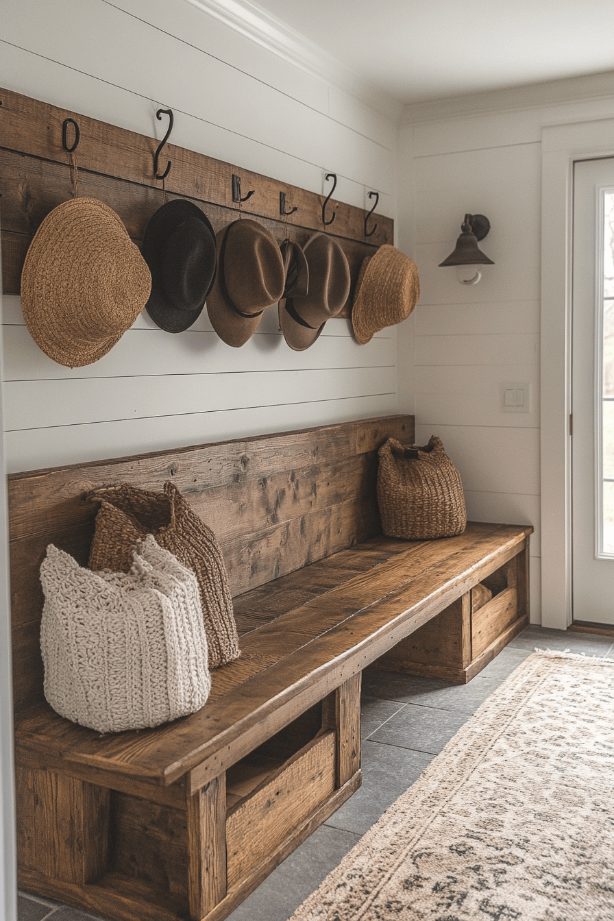 A mudroom lined with wooden cubbies, aged hooks, and gentle lighting creates welcoming order. It’s one of the most authentic antique farmhouse decor ideas, marrying beauty and function. Each distressed detail feels intentional and warm. It’s everyday living with heart.