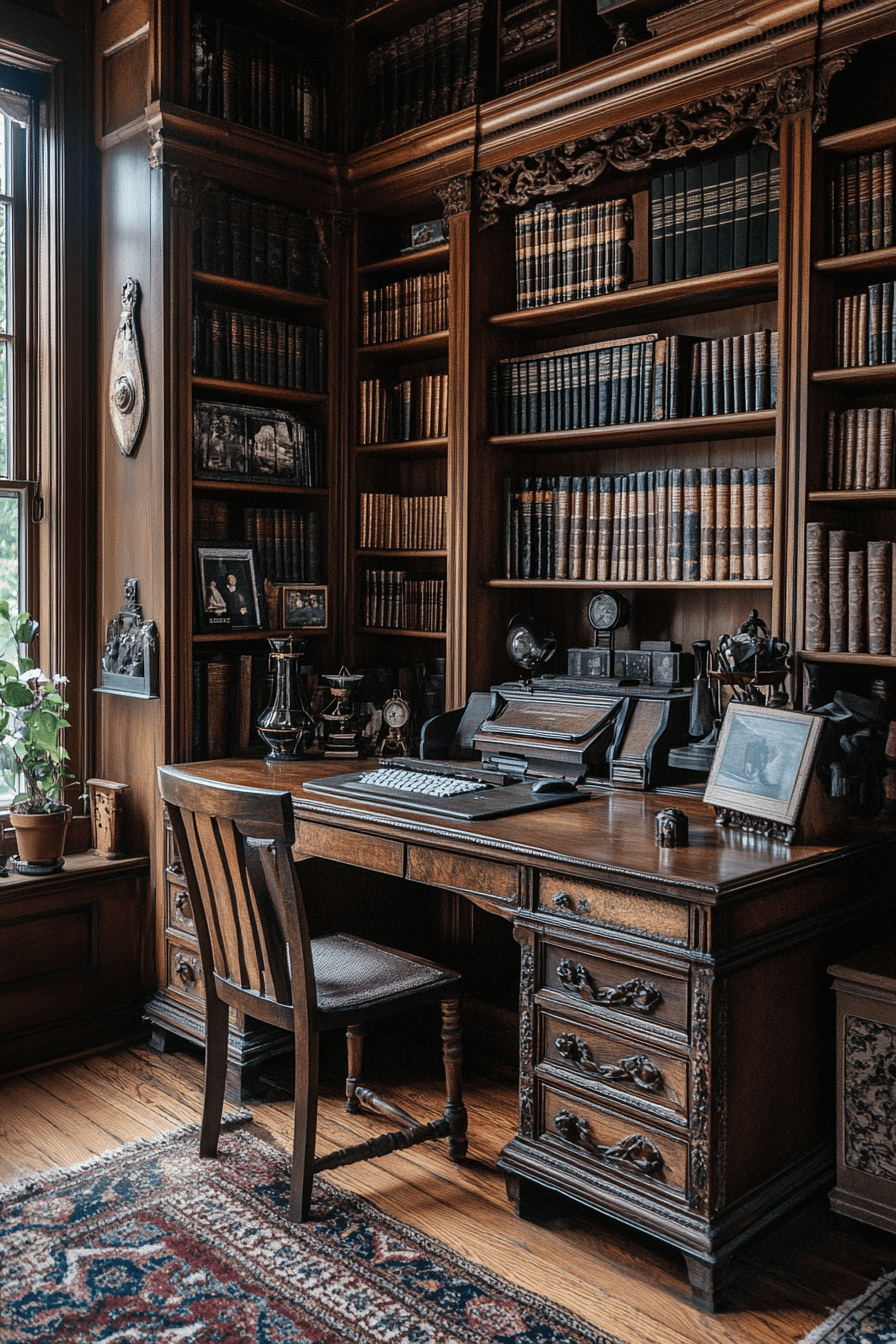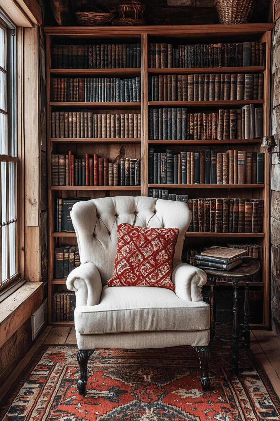 A cozy library lined with old books and soft candlelight turns reading into an experience. It’s one of the dreamiest antique farmhouse decor ideas for quiet moments. The scent of paper and polish fills the room with calm nostalgia. Every shelf glows with character.