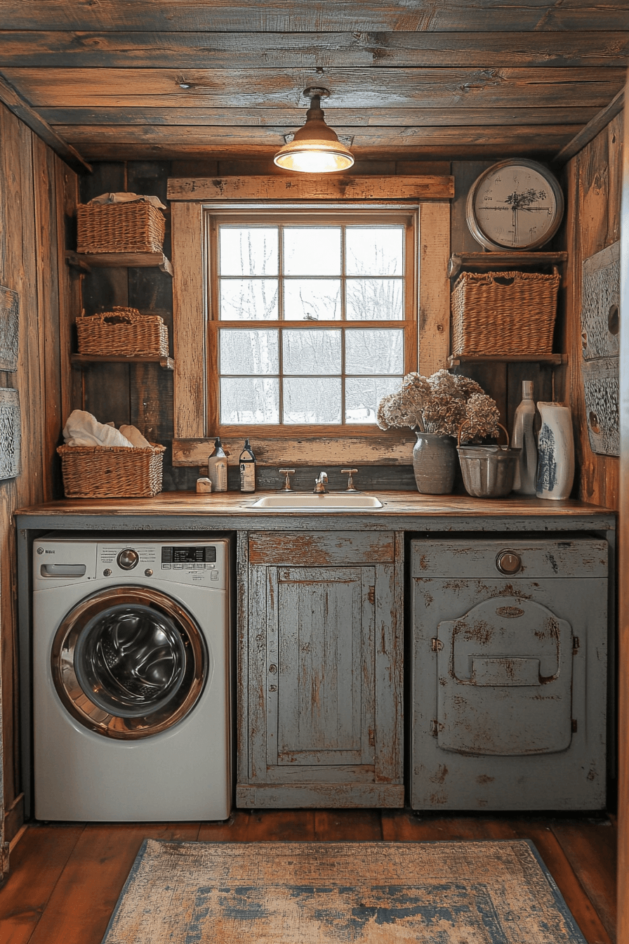 A laundry nook with weathered shelves and a vintage washboard adds a cheerful twist to chores. It’s one of the most endearing antique farmhouse decor ideas you can try. Every soap tin and wooden peg feels like a nod to the past. The space shines with character and simplicity.