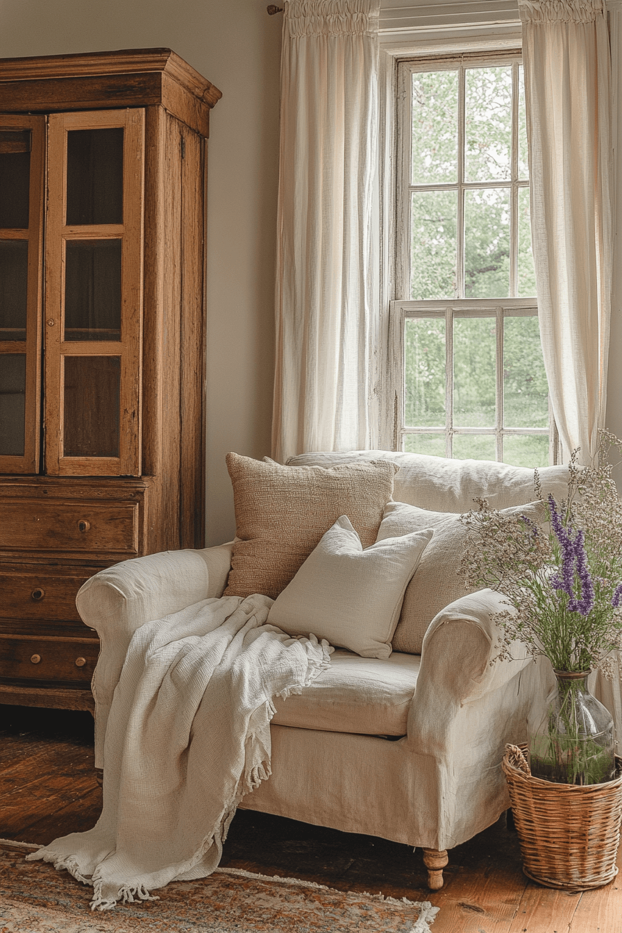 Linen curtains and old shutters never fail to capture the softness of country living. They’re among the gentlest antique farmhouse decor ideas for natural warmth. Their fabric filters sunlight into a golden, peaceful glow. The effect feels both effortless and classic.