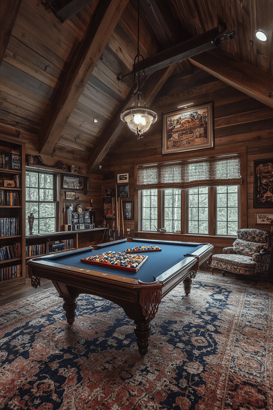A game room anchored by a worn billiard table or weathered chessboard invites laughter and tradition. It’s one of the most nostalgic antique farmhouse decor ideas to bring people together. The imperfections of age make the space glow with authenticity. Every game feels timeless.