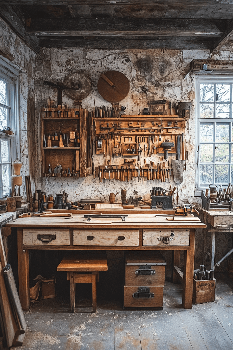 A workshop displaying handcrafted tools and timeworn benches becomes a museum of skill. It’s one of the most inspiring antique farmhouse decor ideas for makers at heart. Every mark tells a story of patience and pride. It’s rustic artistry in motion.