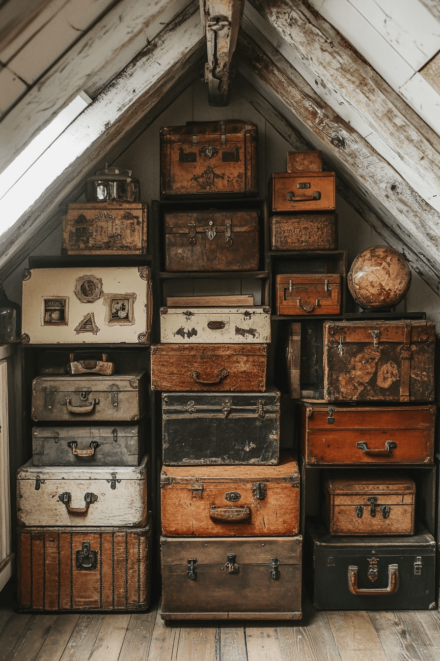 A set of old trunks stacked neatly in the attic brings personality and charm to forgotten corners. These treasures top the list of meaningful antique farmhouse decor ideas. Each scuff and buckle speaks of history and travel. They make organization both practical and beautiful.