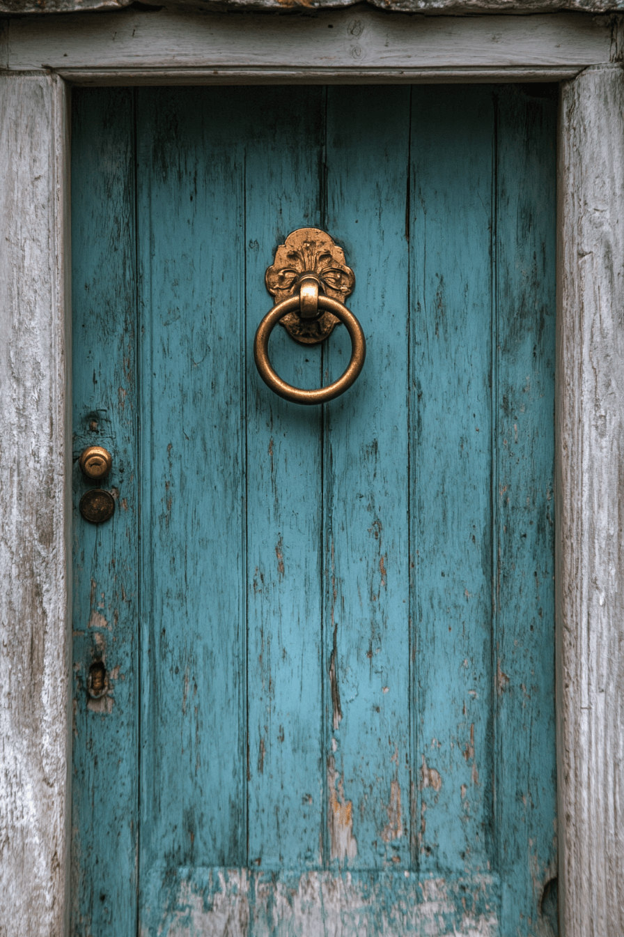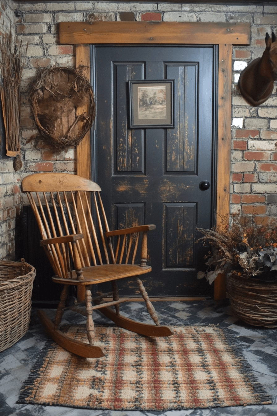 A door knocker made from aged brass or iron adds instant sophistication to your entryway. It’s among the most eye-catching antique farmhouse decor ideas for a perfect welcome. The patina glows with charm that only time can create. It’s subtle, classic, and full of personality.