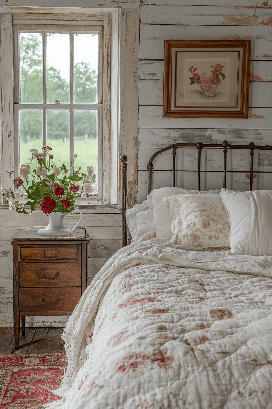 A bedroom layered with linen, chippy paint, and natural hues becomes a tranquil country escape. It’s one of the most peaceful antique farmhouse decor ideas for evoking serenity and charm. The weathered wood furniture whispers quiet history. Every corner feels slow, soothing, and grounded.