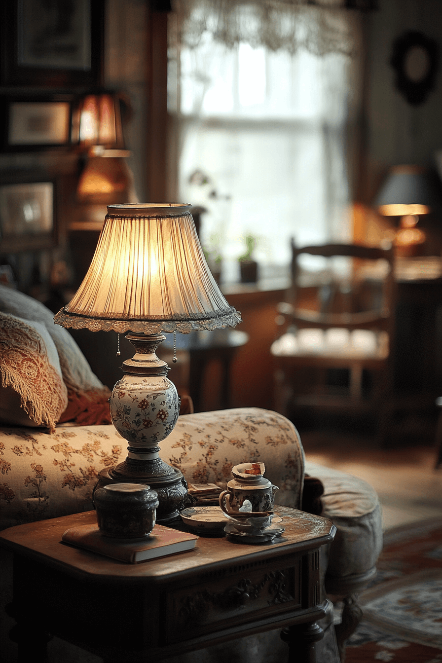 A living room illuminated by a delicate heirloom lamp feels deeply inviting. Its aged brass and soft glow embody the essence of antique farmhouse decor ideas. The vintage detailing blends perfectly with rustic furnishings and calm neutrals. It’s history and comfort woven into one moment.