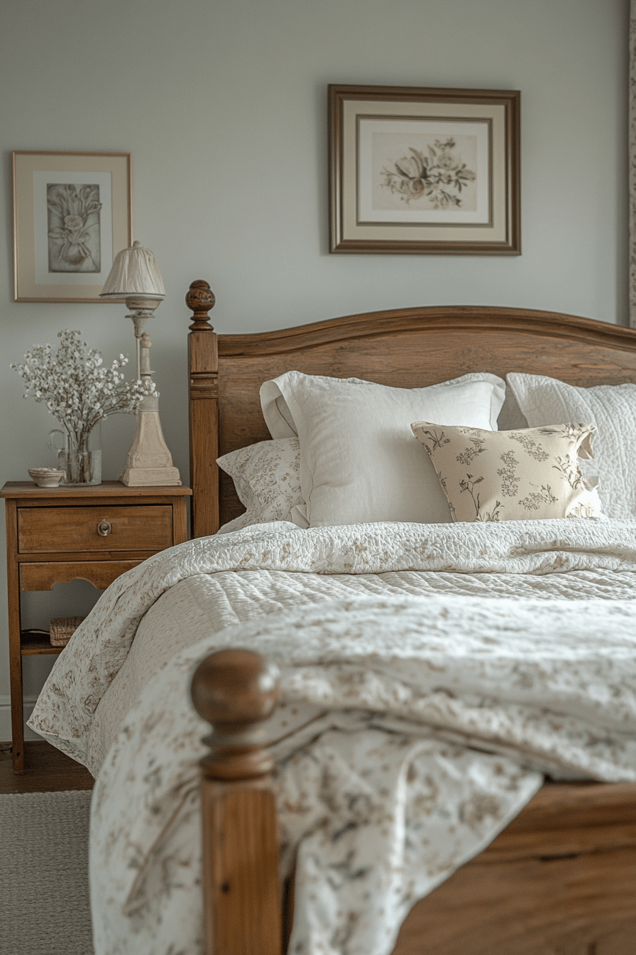 A guest bedroom layered with vintage linens and candlelight feels like a storybook escape. It’s one of the most heartwarming antique farmhouse decor ideas for true hospitality. The atmosphere blends serenity and history. Each piece whispers warmth and grace.