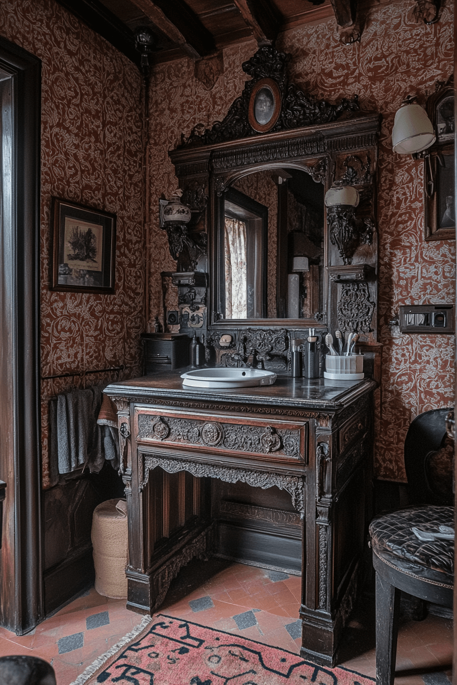 A vanity made of antique wood and adorned with vintage mirrors adds romance to daily routines. It’s a shining example of antique farmhouse decor ideas done right—elegant yet effortless. The aged patina and gentle carvings create an old-world glow. It’s functional, nostalgic, and graceful all at once.