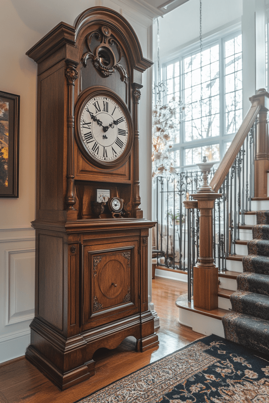 A tall grandfather clock adds old-fashioned charm and rhythm to your entryway. This timeless accent remains one of the most elegant antique farmhouse decor ideas. Its ticking fills the air with nostalgic calm. Every curve and grain in the wood tells a story of patience and craft.