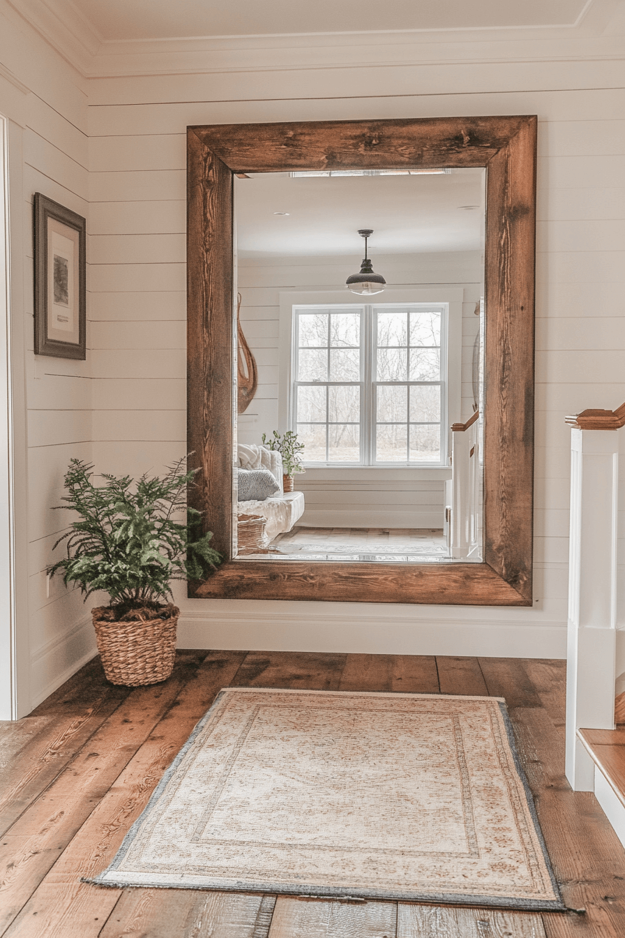 A distressed mirror framed in rustic wood becomes both statement and sentiment. It reflects light and legacy—one of the most iconic antique farmhouse decor ideas. The weathered edges highlight craftsmanship from another era. It’s a small detail with big personality.