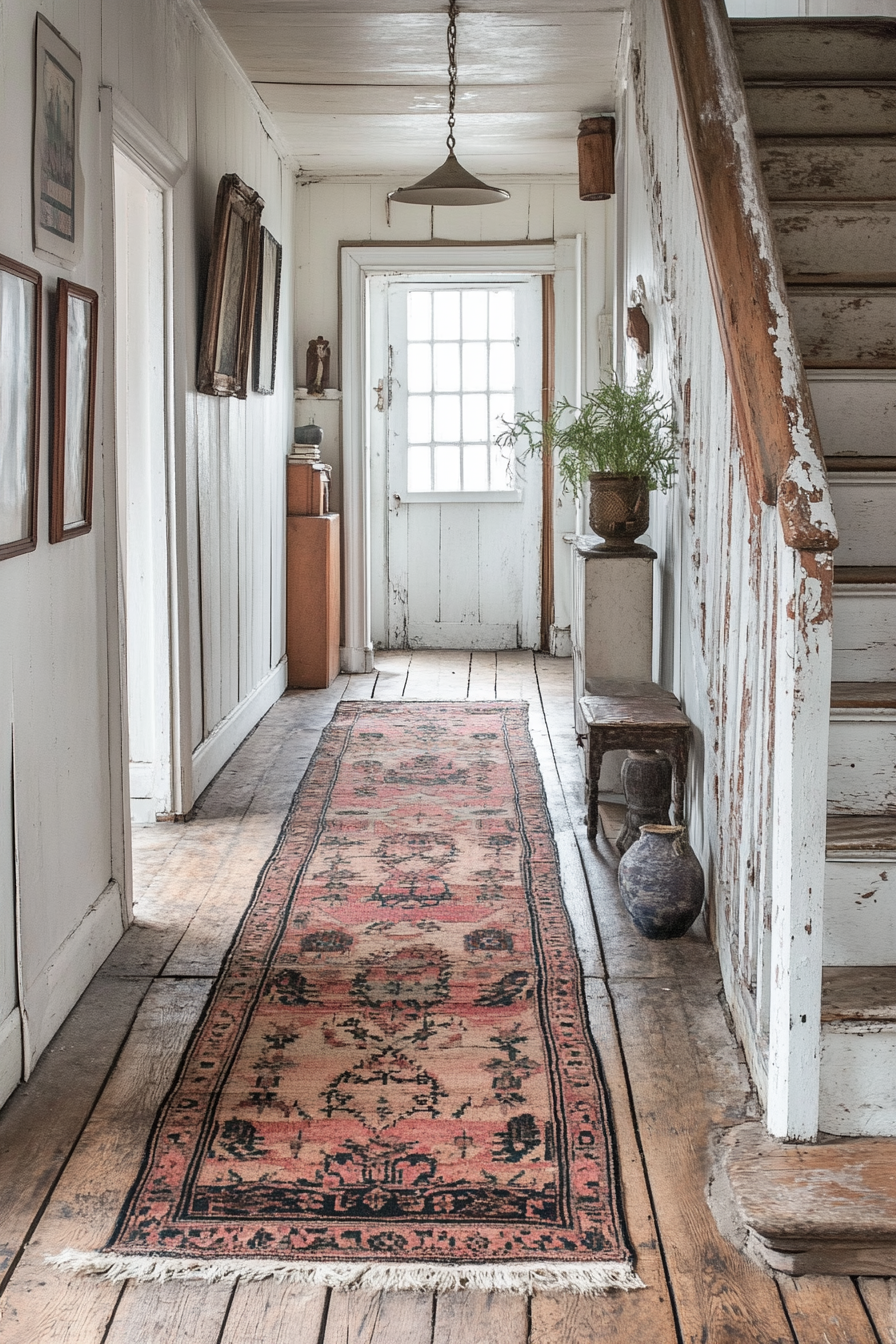 A faded hallway runner woven with intricate designs brings heritage underfoot. It’s one of the simplest antique farmhouse decor ideas that transforms empty space into warmth. Its muted colors pair beautifully with aged wood floors. Every step feels steeped in history.