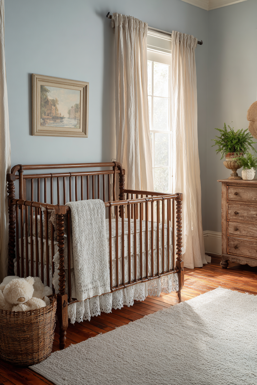 A nursery touched by antiques feels full of love and softness. Wooden cribs, lace details, and worn finishes make it a dream come true among antique farmhouse decor ideas. The soothing palette creates warmth and safety. It’s both delicate and meaningful.