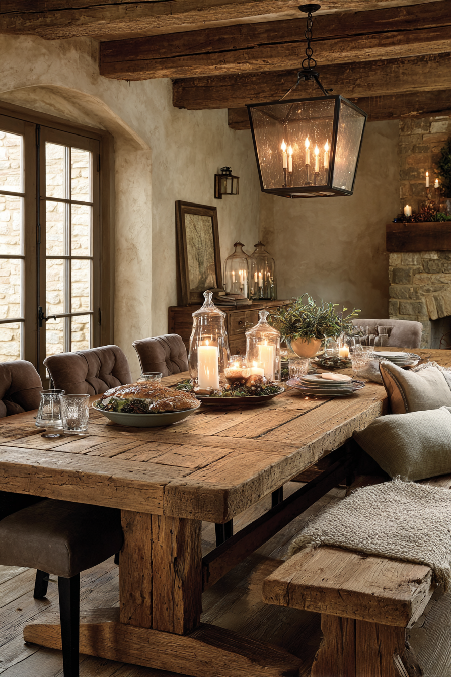 A farmhouse dining space filled with worn finishes and candlelight makes every meal unforgettable. Among the most heartfelt antique farmhouse decor ideas, this look celebrates togetherness and old-world charm. The texture of reclaimed wood adds authenticity and love to the setting. Every scratch feels like a shared memory.