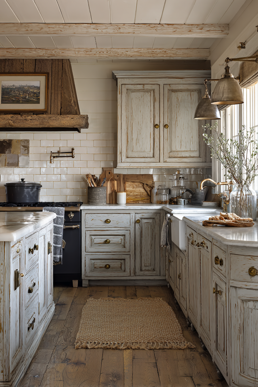 A kitchen anchored by weathered cabinets and aged accents brings soul to every meal. It’s one of the most beloved antique farmhouse decor ideas for creating depth and charm. Faded paint and brass knobs make it feel lovingly worn yet beautiful. The atmosphere is both cozy and inspiring.