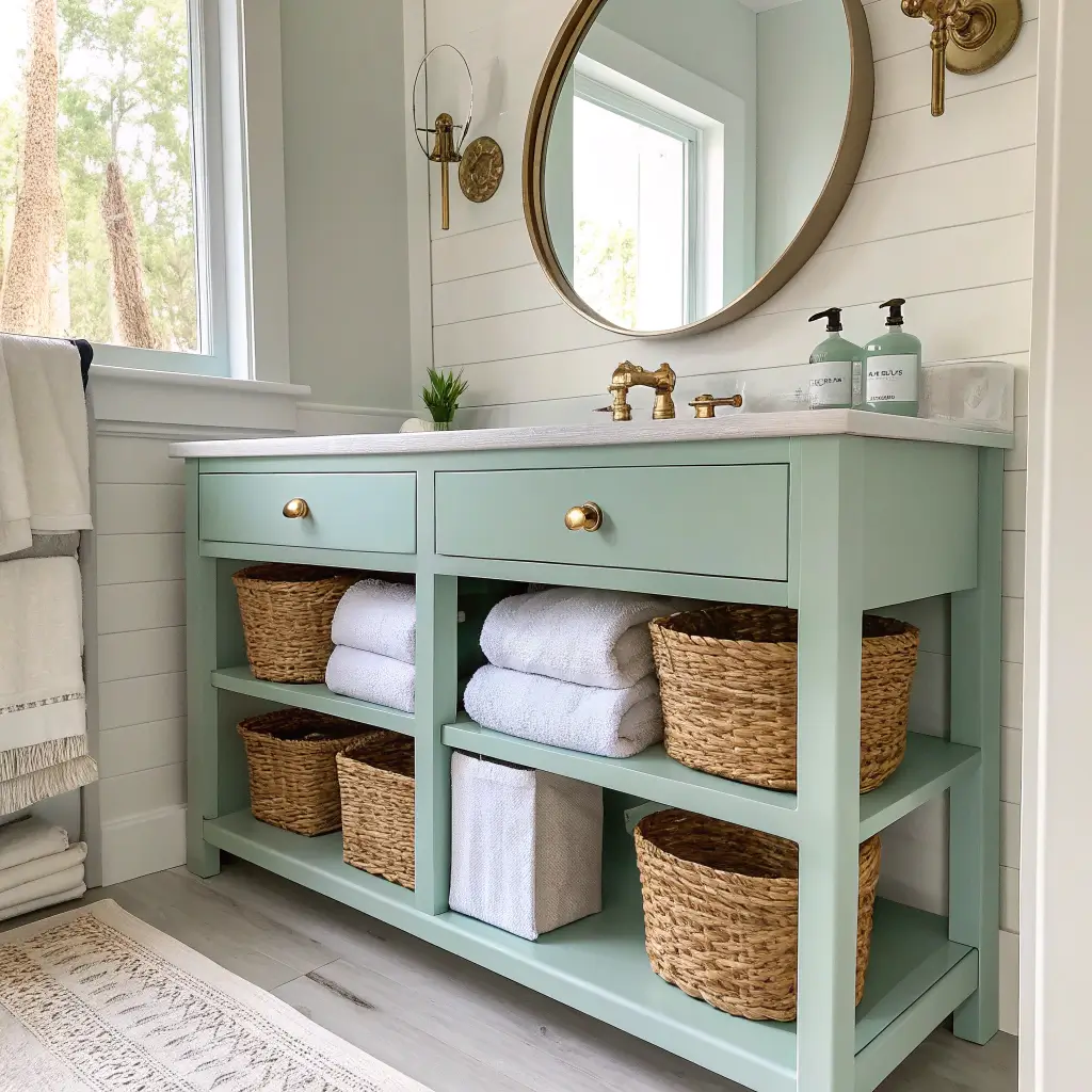 Pastel cabinet colors like mint or powder blue bring a soft, calming vibe.
