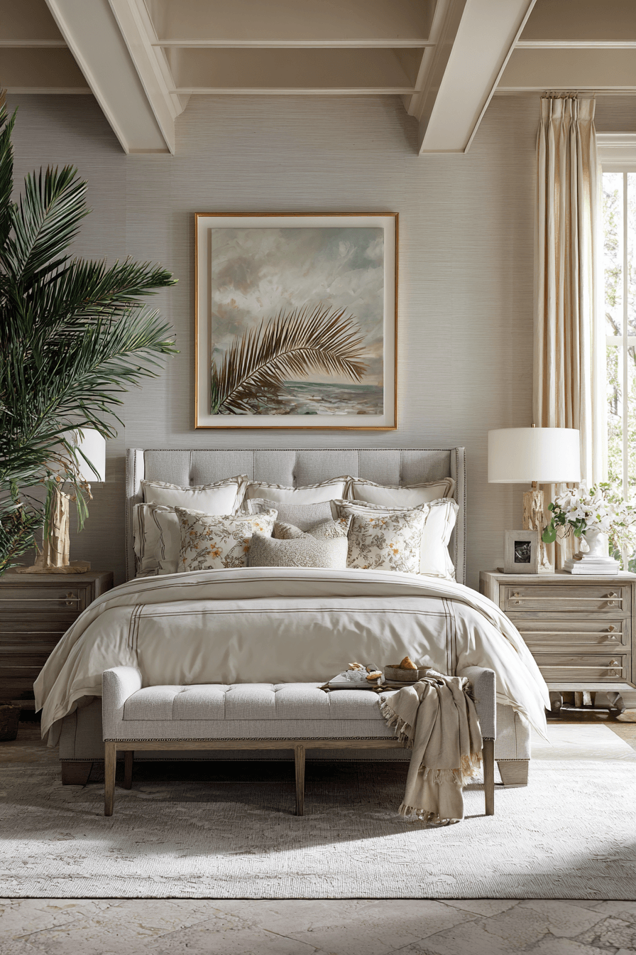A soft tropical influence shapes these beach bedroom ideas, blending airy fabrics with natural textures. Neutral tones keep the design grounded. Light layers add softness and depth. The space feels relaxed yet intentional. The overall vibe is fresh and inviting. Refresh your bedroom with this island-inspired look.