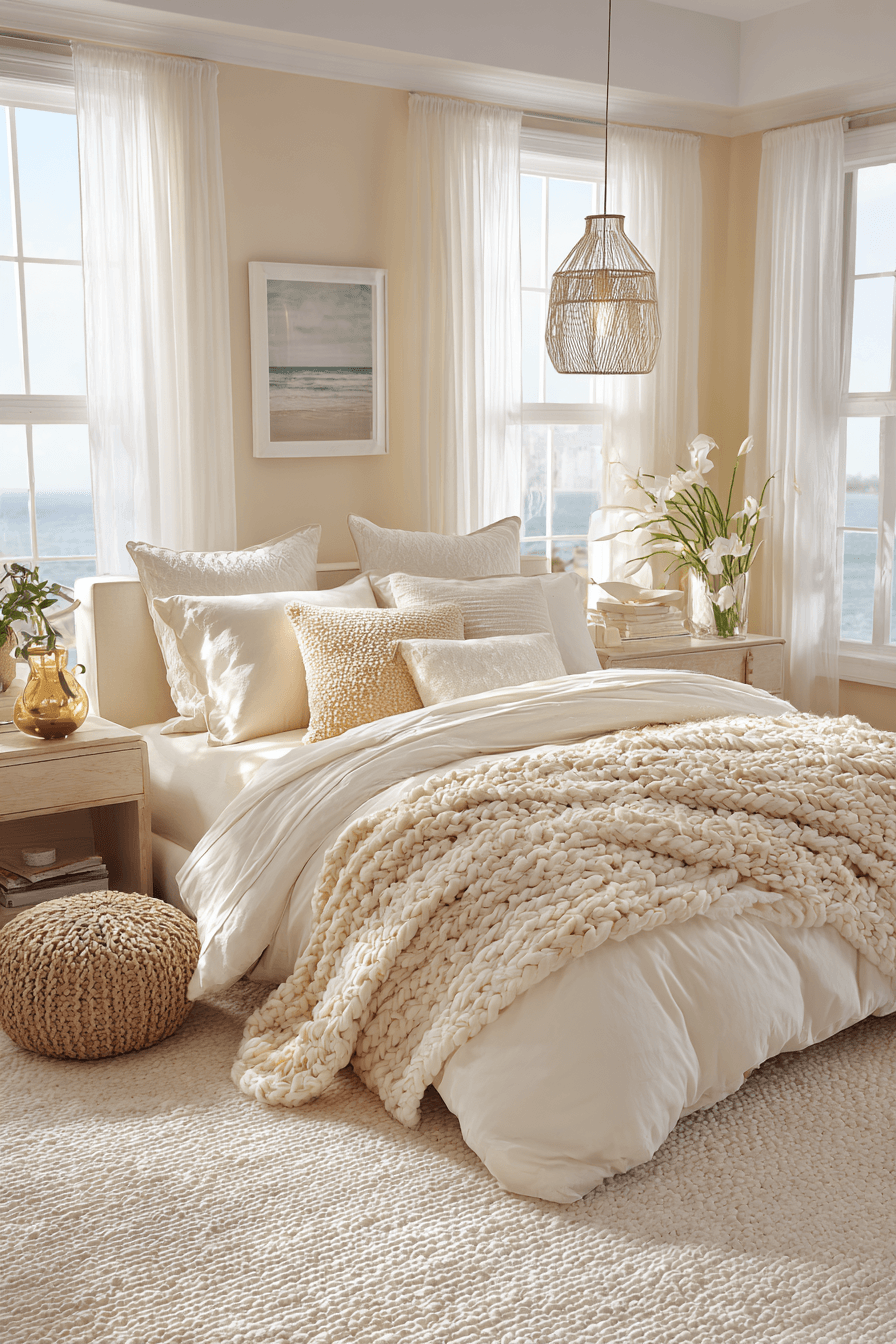 Sun-washed tones define these beach bedroom ideas, creating a warm and inviting glow. Beige and ivory shades reflect light beautifully. Layered textures keep the design engaging. The palette remains soft and cohesive. The room feels cozy yet airy. Add these warm hues and create a comforting coastal bedroom.
