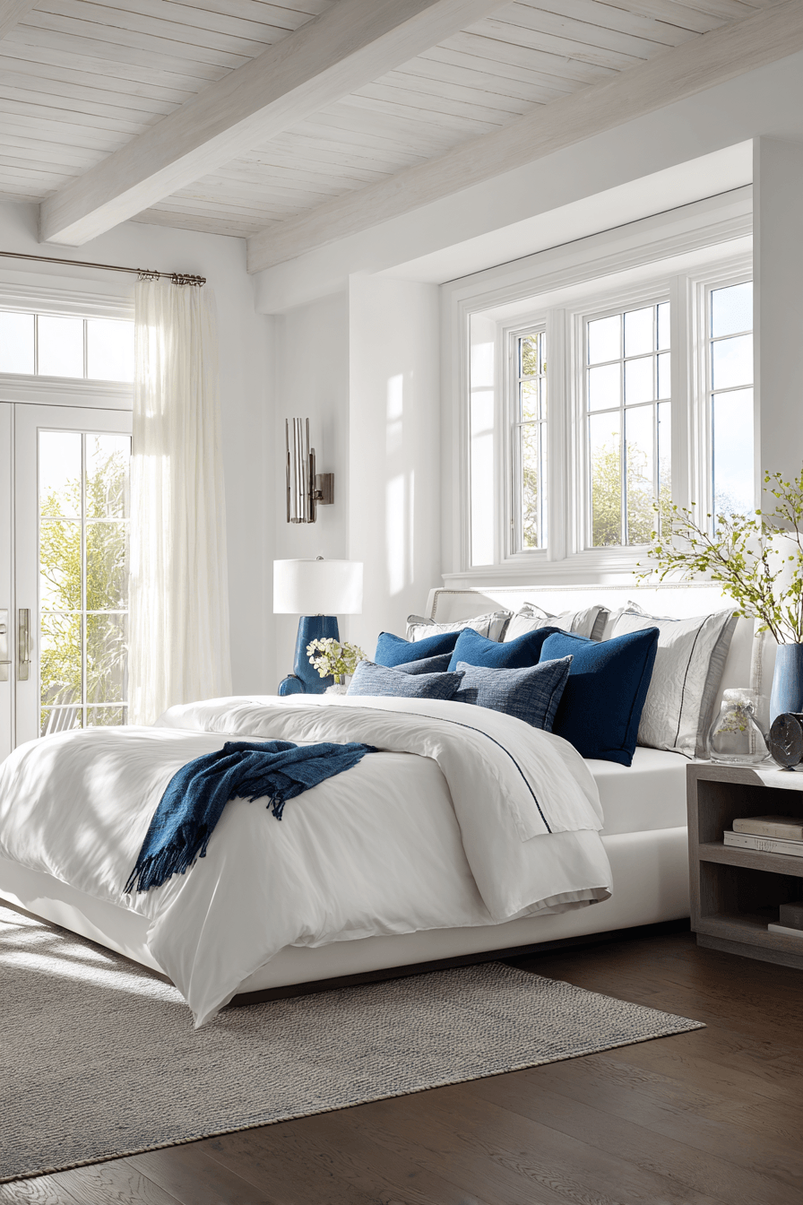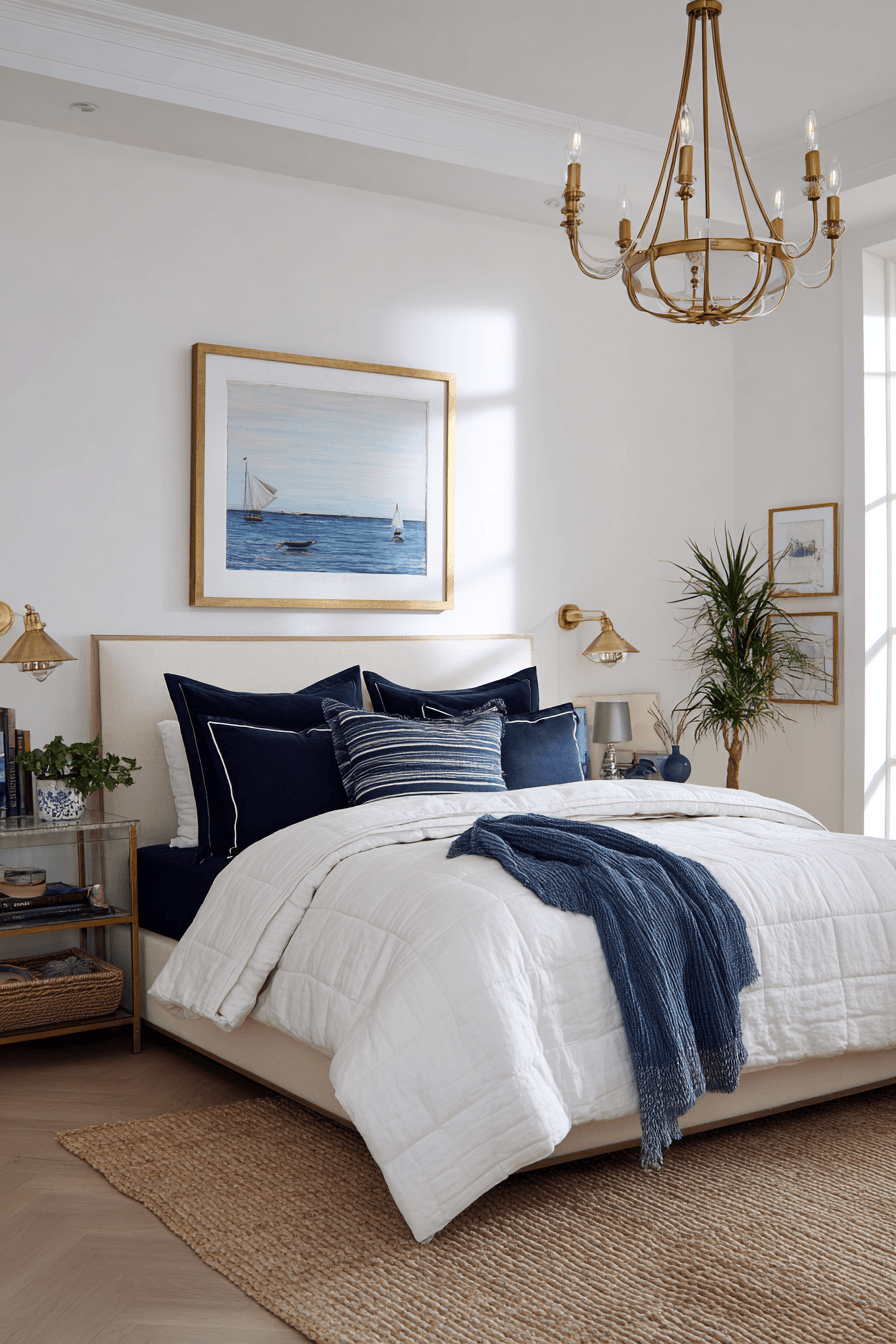 A modern coastal contrast defines these beach bedroom ideas, blending bold navy with crisp white. Clean lines keep the design fresh. Metallic accents add subtle polish. Soft textures balance the contrast. The space feels both bold and calming. Update your bedroom with this modern coastal style.