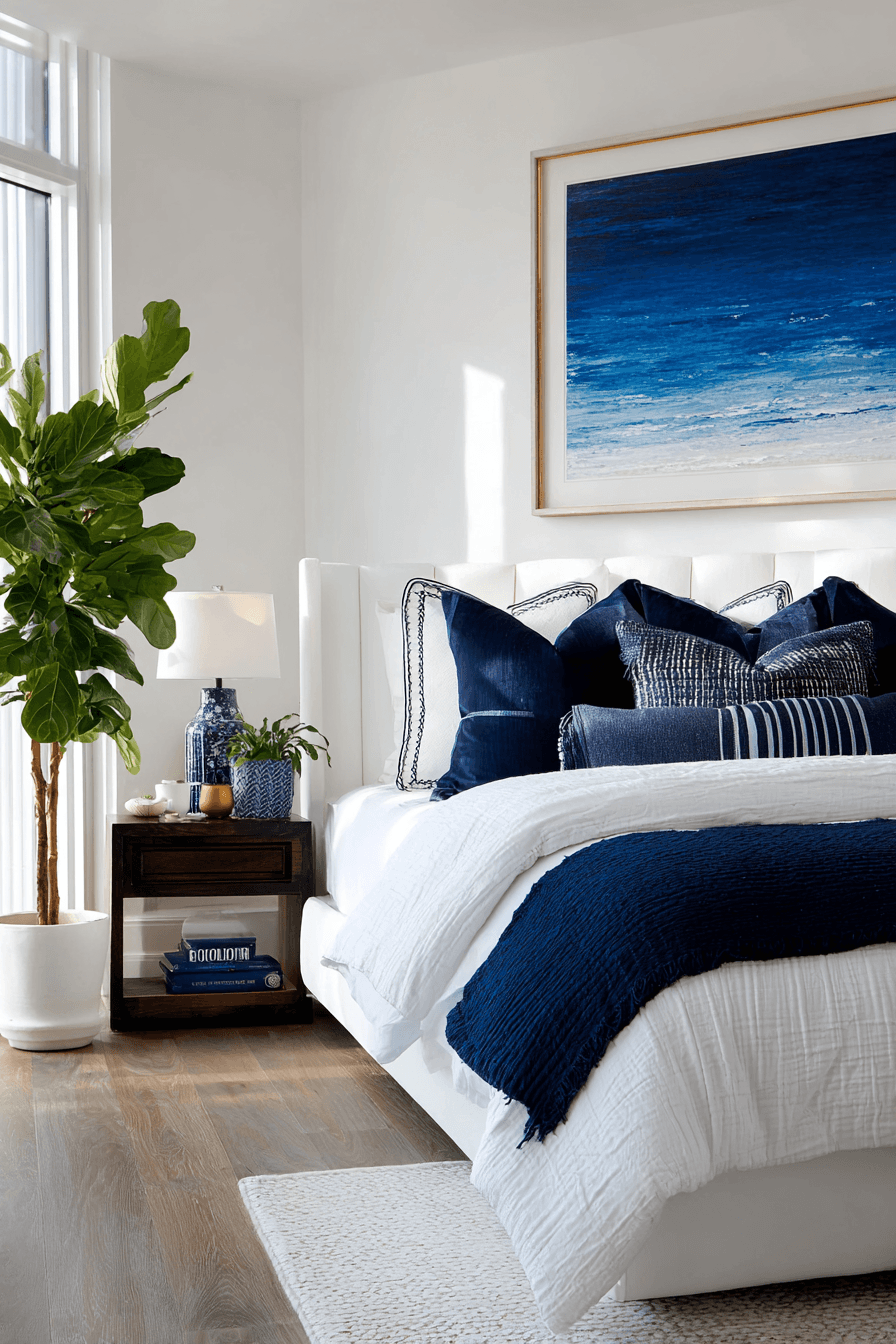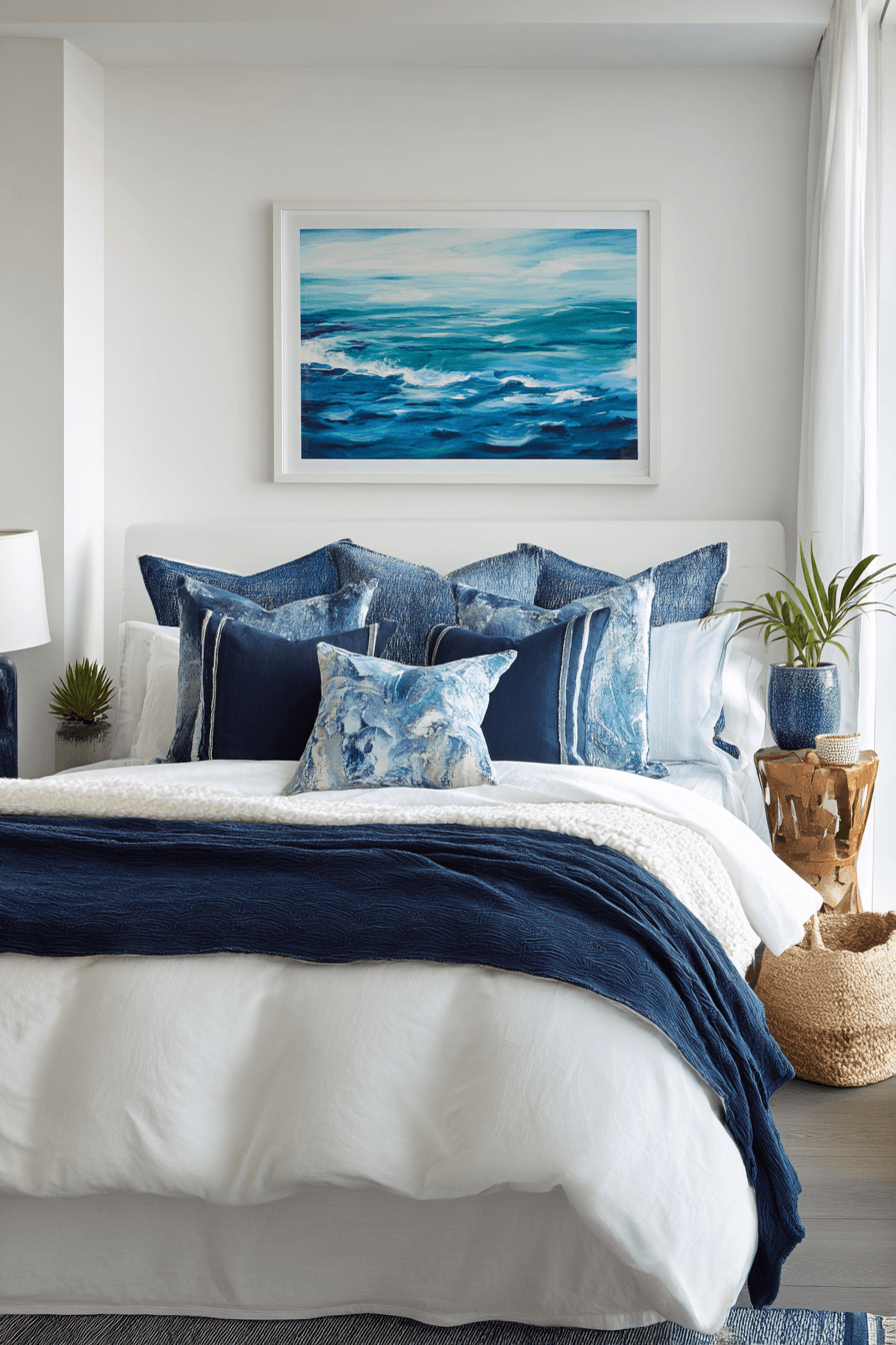 A polished coastal aesthetic defines these beach bedroom ideas, combining modern simplicity with ocean-inspired color. Deep blues contrast beautifully with crisp whites for a clean look. Streamlined furniture keeps everything organized and intentional. Soft lighting warms the overall design. The space feels both refined and livable. Bring this sleek coastal style into your bedroom and elevate your space instantly.
