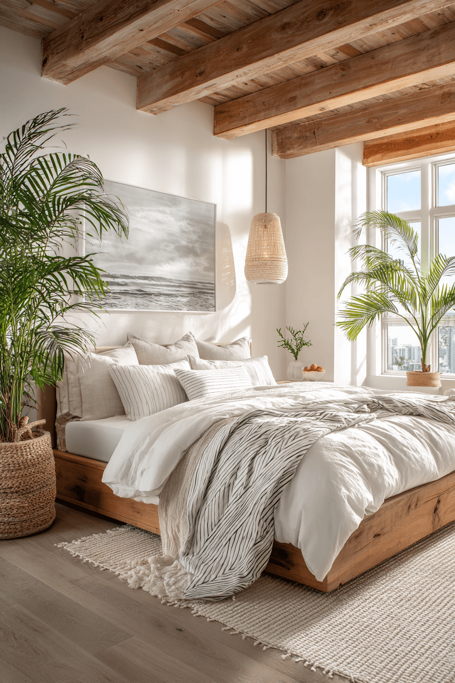 A hint of tropical flair enhances these beach bedroom ideas, adding freshness without overpowering the design. Light patterns and natural materials create visual interest. Neutral backdrops keep everything balanced. Warm textures add depth. The overall feel is breezy and relaxed. Add subtle tropical touches and refresh your bedroom style.