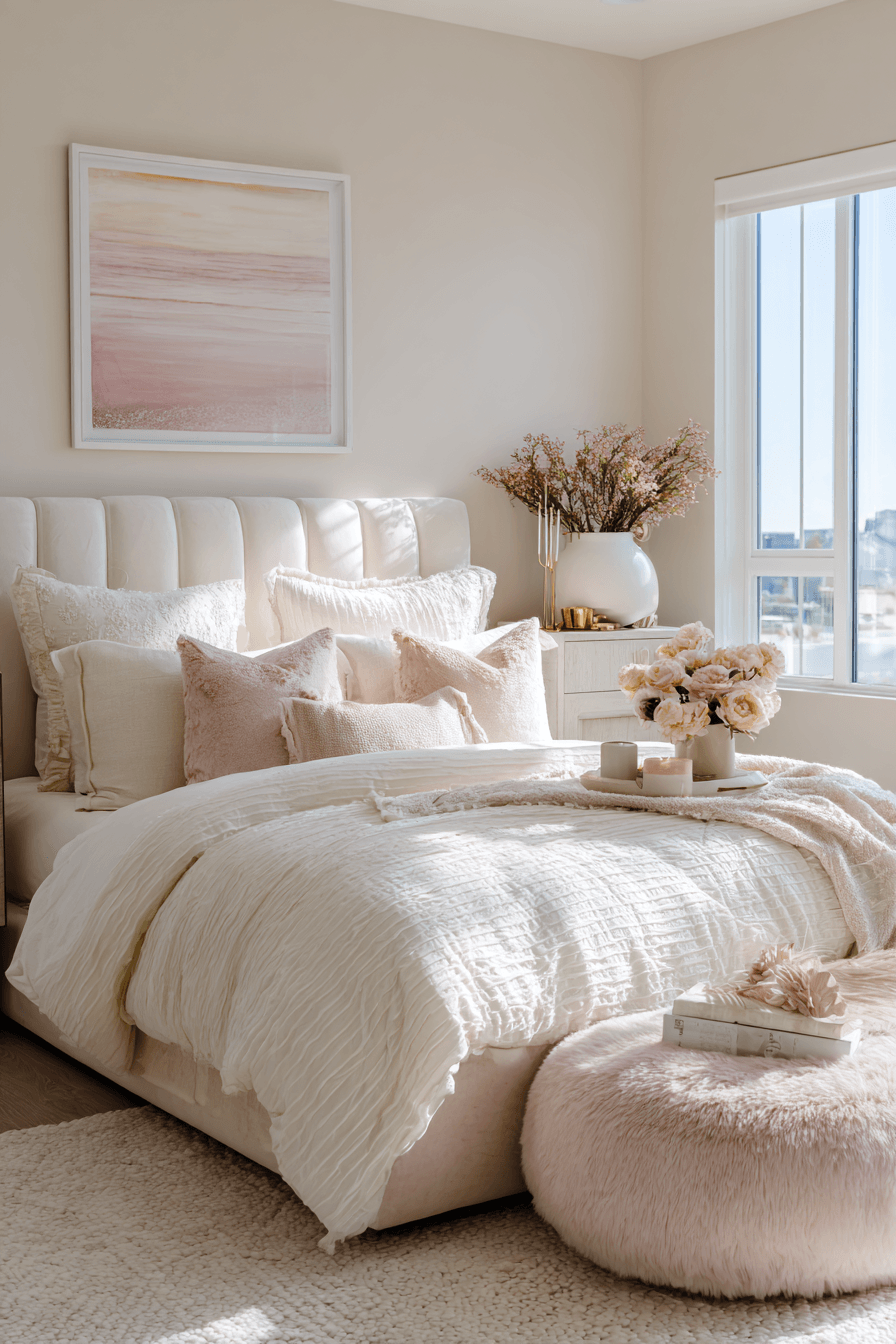 Seashell-inspired tones define these beach bedroom ideas, creating a gentle and calming palette. Soft creams and blush hues add warmth. Rounded decor reflects natural coastal shapes. Light enhances the airy atmosphere. The room feels peaceful and soft. Introduce this seashell palette and enjoy the calming effect.