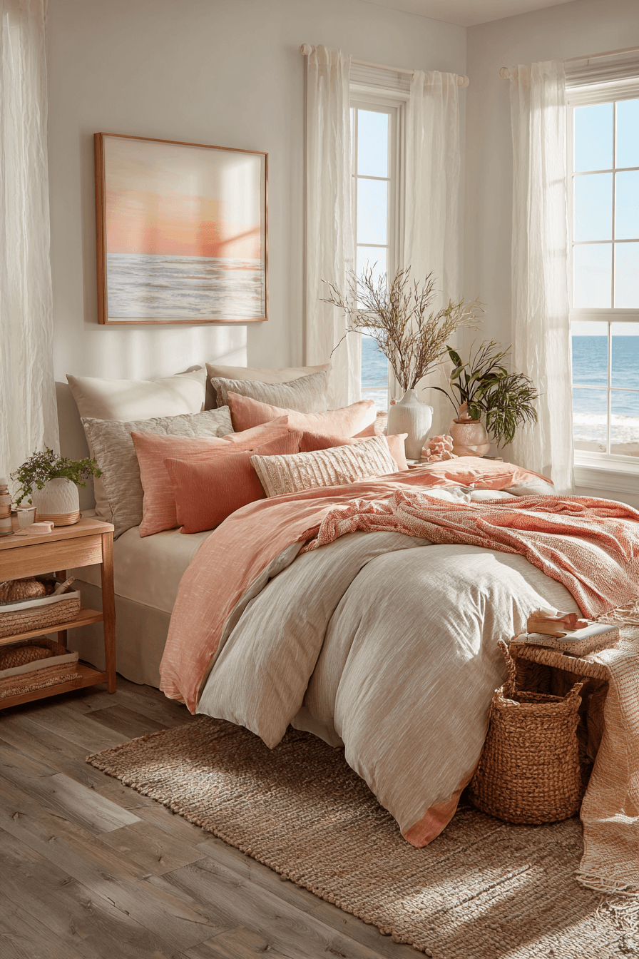 Sunset hues inspire these beach bedroom ideas, bringing warmth and softness into the space. Peach and coral tones create a glowing atmosphere. The palette feels cozy yet airy. Simple furniture allows the colors to shine. The mood feels romantic and calming. Add sunset tones and create your dream coastal escape.