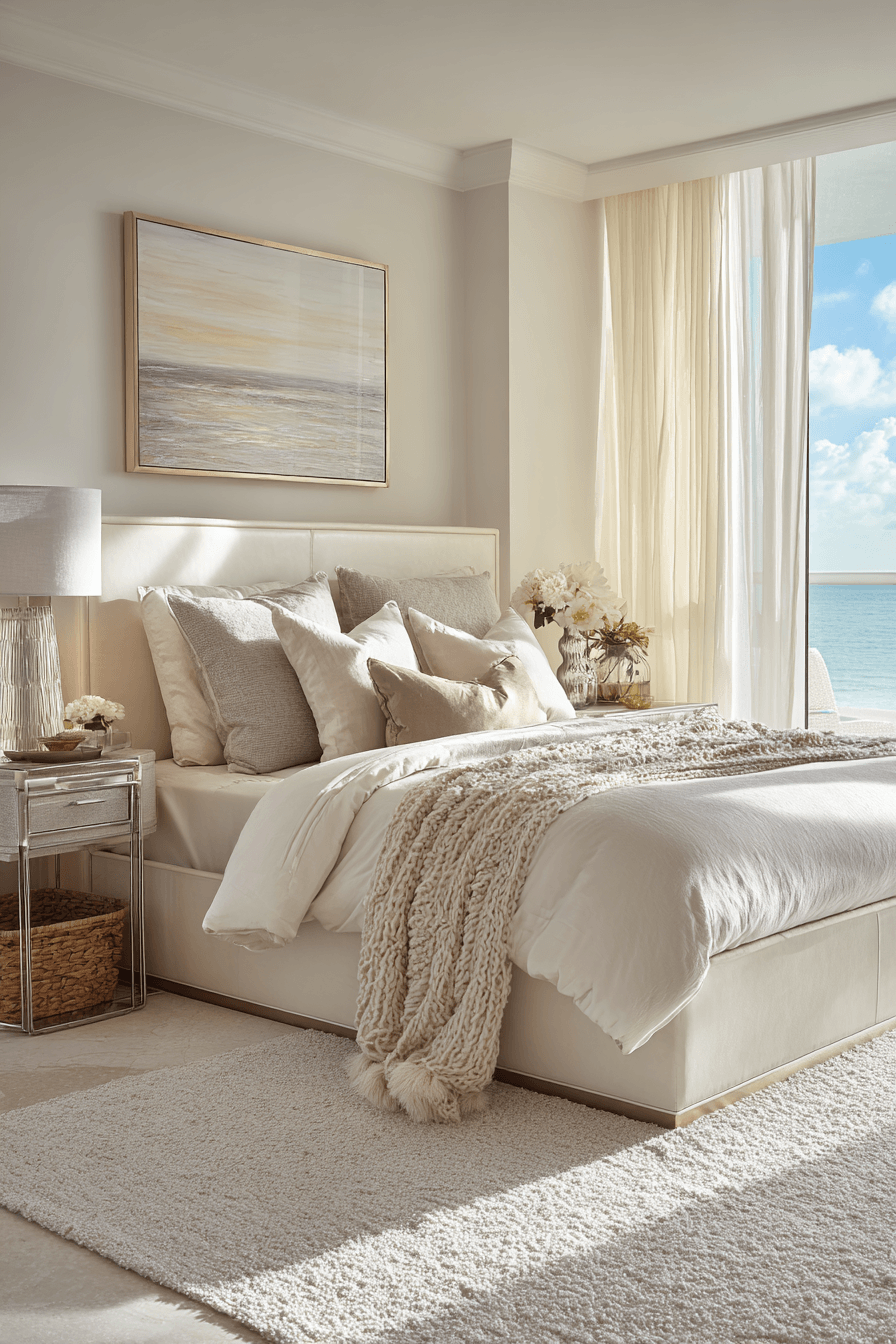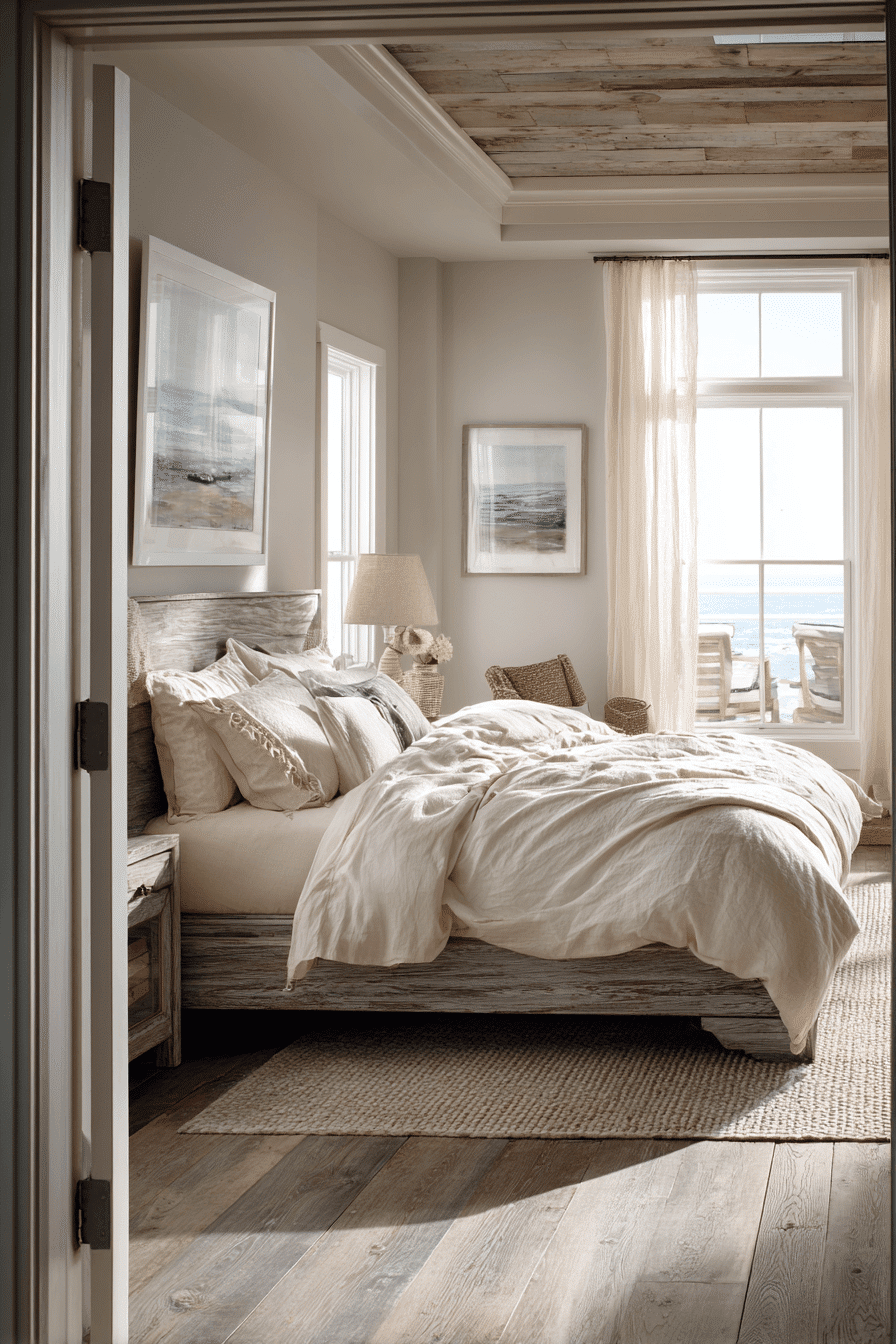 A refined coastal aesthetic shapes these beach bedroom ideas, focusing on simplicity and texture. Neutral tones create a soft base. Plush bedding enhances comfort. Minimal decor keeps the design uncluttered. The space feels welcoming yet polished. Try this elegant coastal approach and elevate your bedroom.
