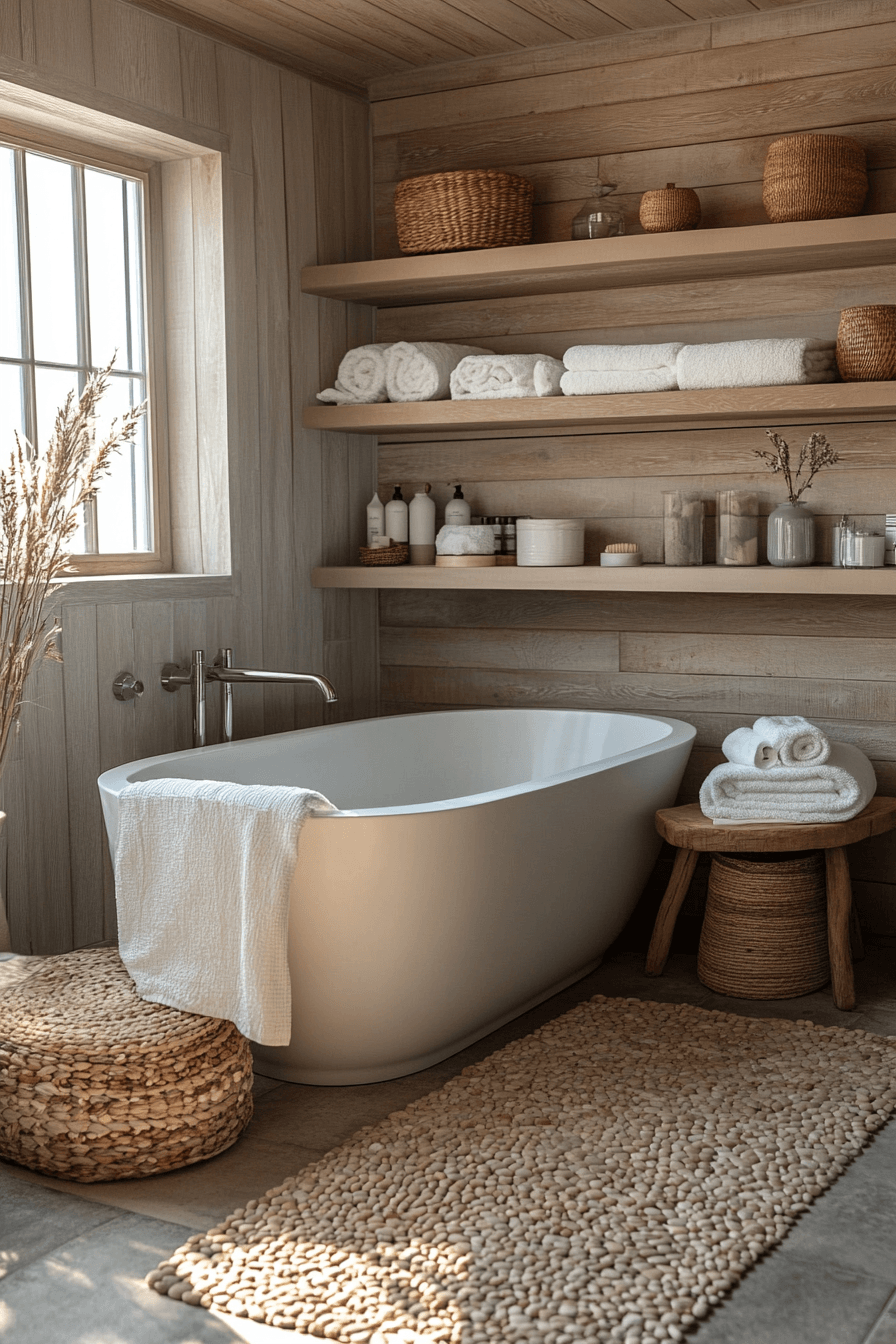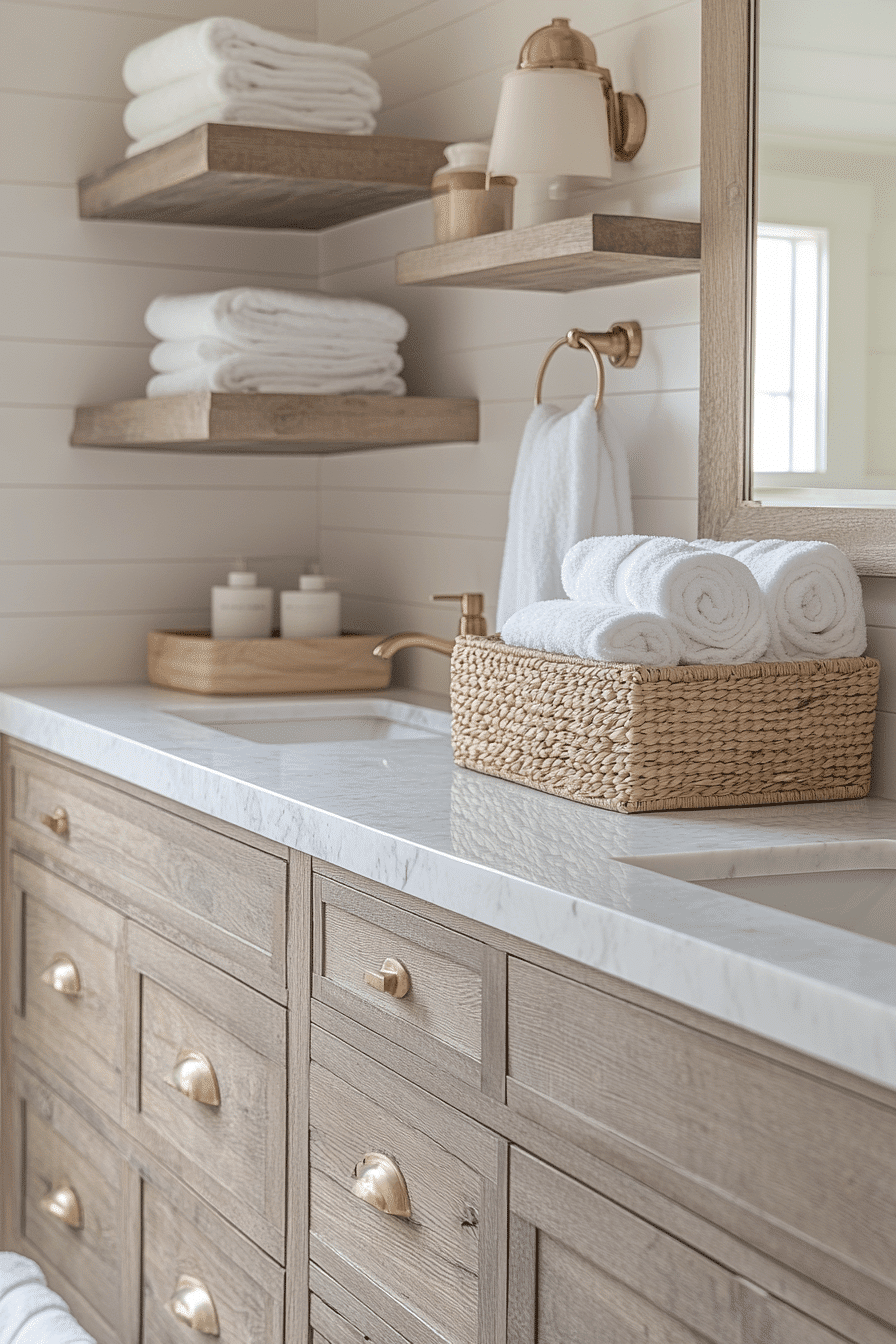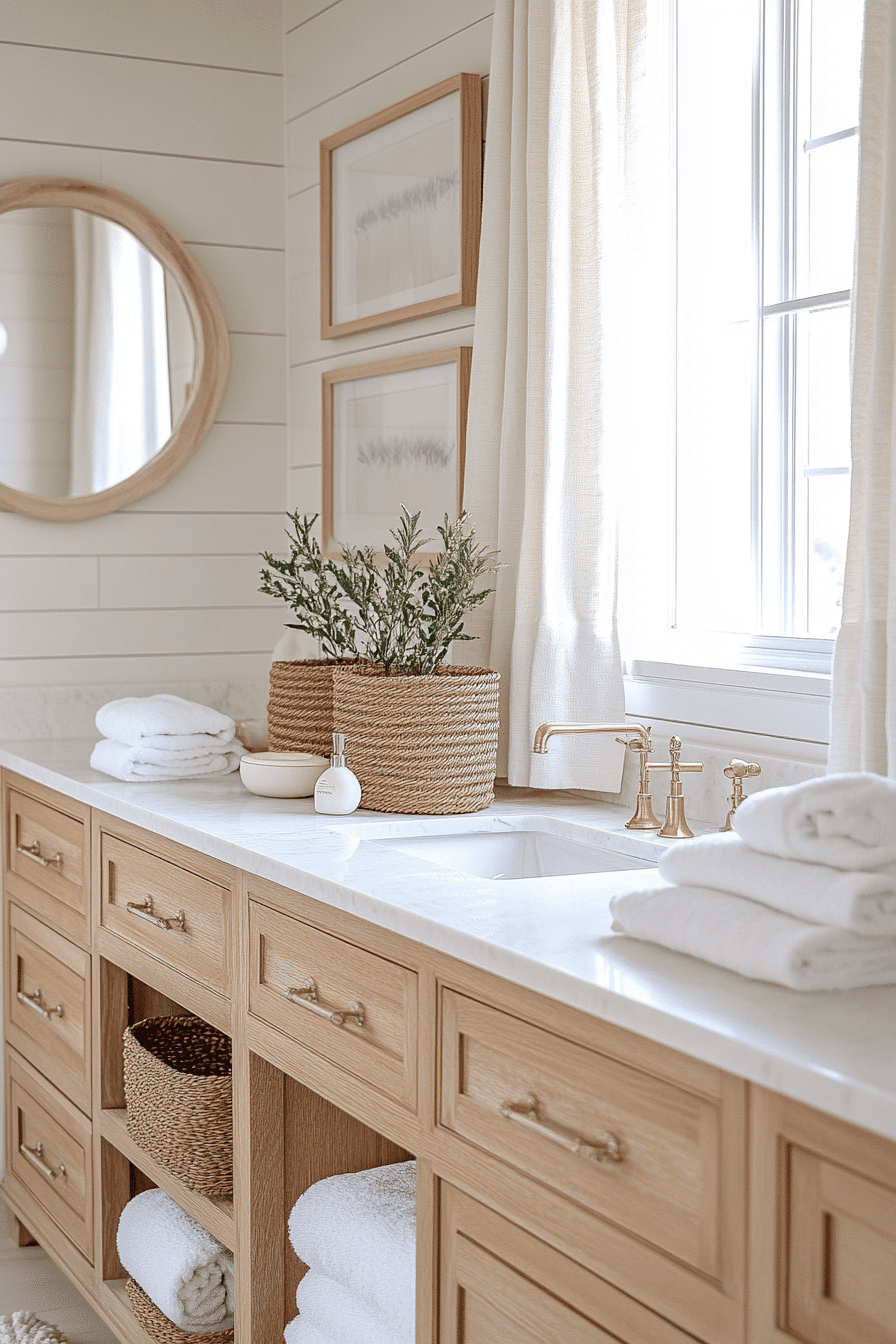 Natural wood elements bring character and warmth into this inviting beach house bathroom. Soft neutral tones keep everything light while textured surfaces add interest. The balance between organic and polished materials feels effortless. Clean lines ensure the design stays modern. The space feels grounded yet fresh. Add these earthy touches and transform your bathroom with ease.