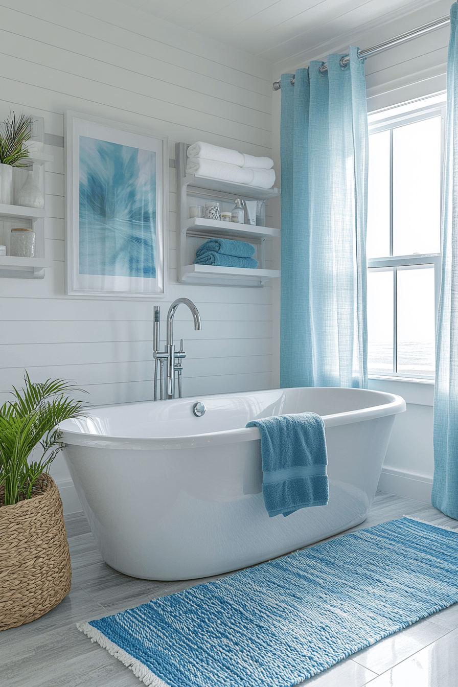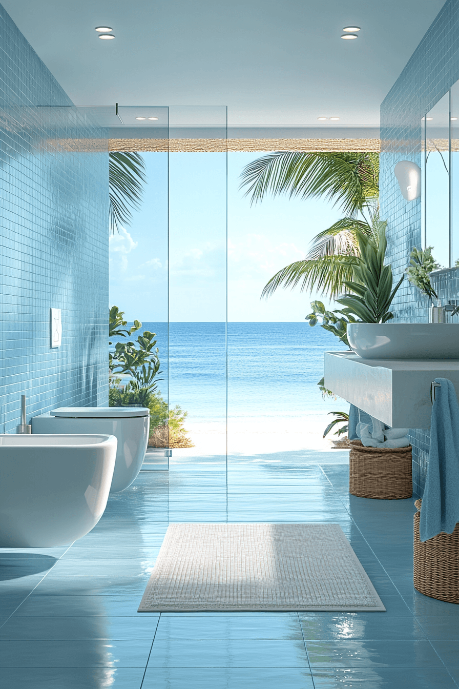 Cool, calming tones inspired by the sea shape this tranquil beach house bathroom design. Light blue shades create a gentle focal point while white finishes keep things bright. The palette feels peaceful and timeless. Soft textures enhance the overall comfort. The space invites relaxation without feeling heavy. Introduce these ocean-inspired tones and create a calming retreat.