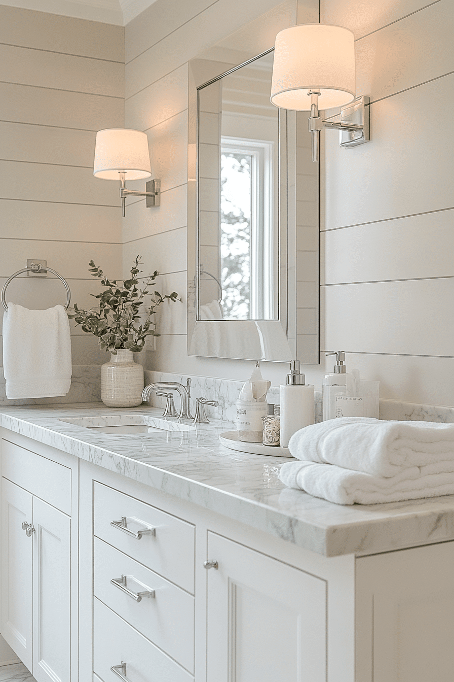A fresh, white-forward palette transforms a beach house bathroom into a crisp and calming retreat. Smooth surfaces bounce light around the room, enhancing the sense of space. Gentle metallic finishes and soft fabrics add a polished yet relaxed touch. The simplicity keeps everything clean and breathable. Small coastal accents complete the look beautifully. Recreate this bright, refreshing vibe and enjoy the difference instantly.