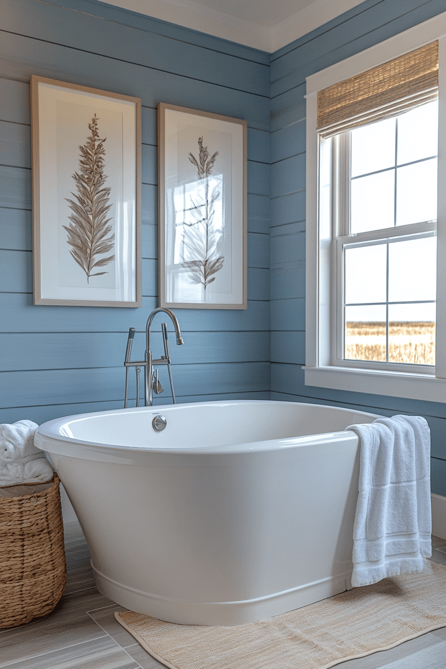 A calming blend of cool tones creates a harmonious beach house bathroom that feels effortlessly balanced. Soft blues and crisp neutrals work together seamlessly. Sleek finishes keep the look modern and clean. Gentle textures add warmth. The space feels fresh and timeless. Bring this soothing palette into your home and enjoy the calm.