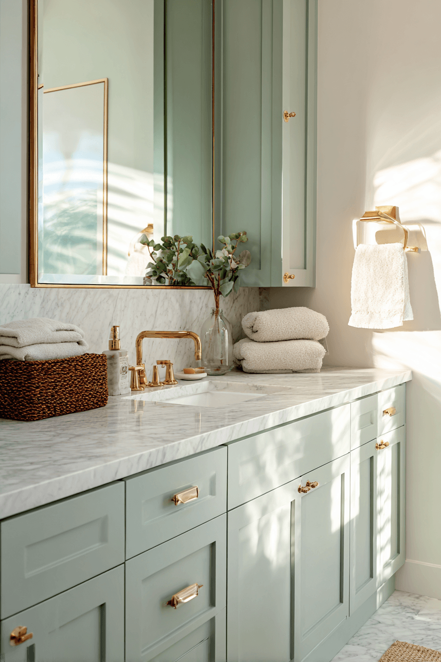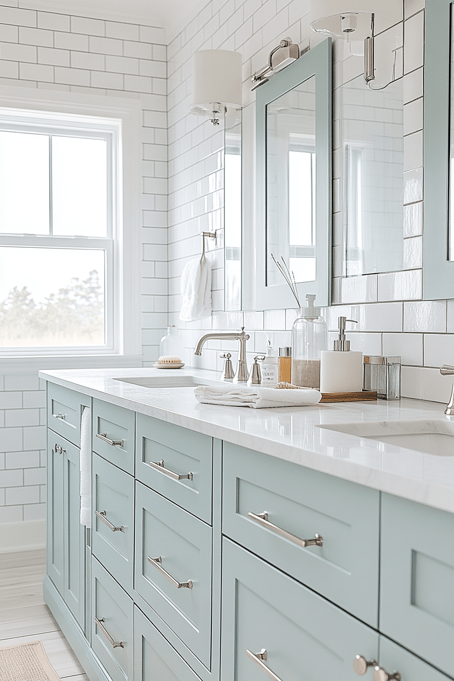 Subtle green-blue hues bring a refreshing feel to this elegant beach house bathroom. The tones feel light and breezy while still adding personality. Paired with bright surfaces, the space stays open and airy. Natural materials enhance the coastal vibe. The overall look is refined yet relaxed. Elevate your bathroom with this soft, refreshing color story.