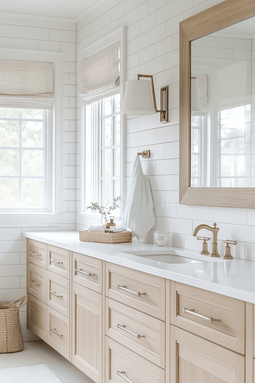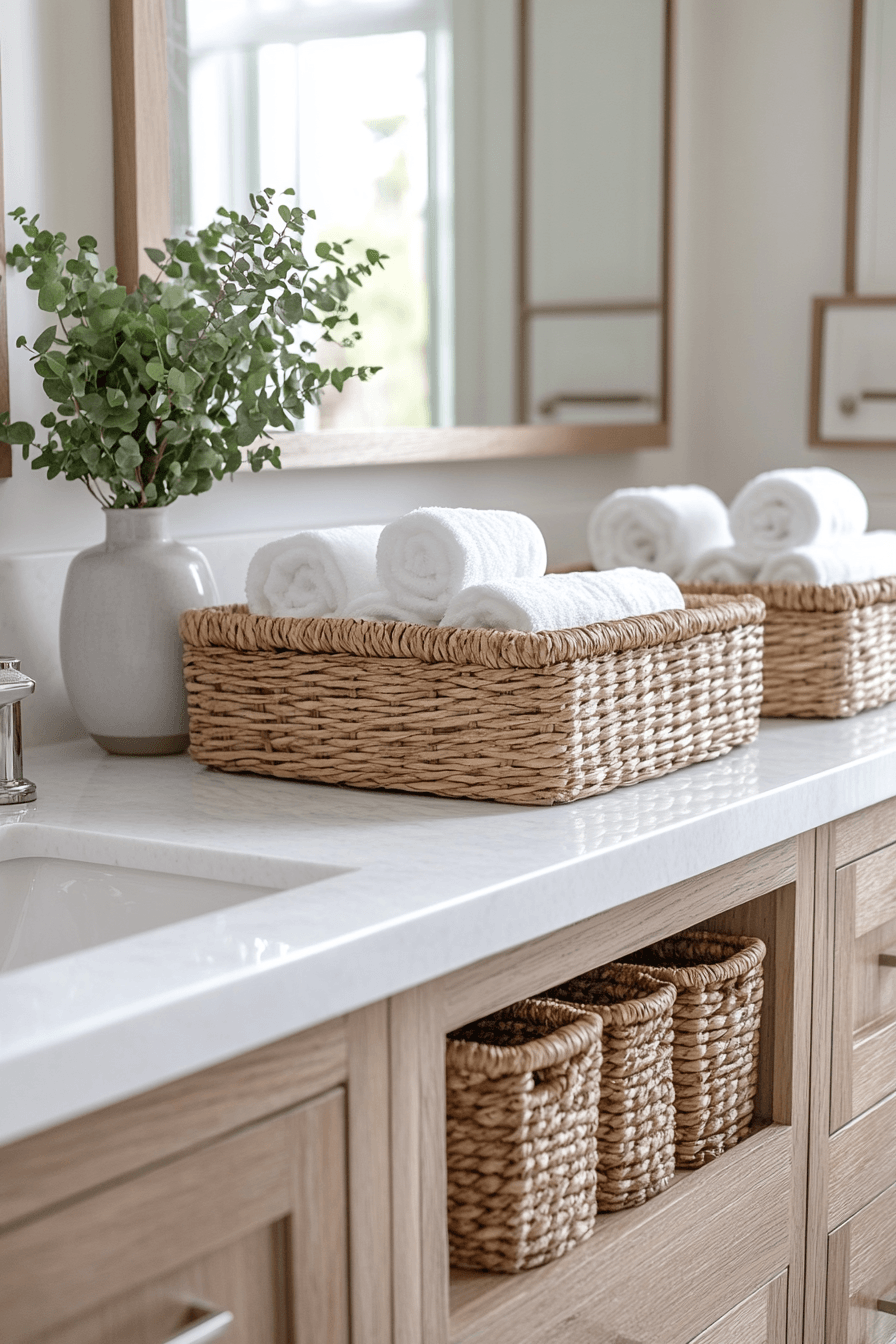 Woven details paired with bright finishes create a welcoming beach house bathroom that feels both airy and warm. Natural textures add dimension while keeping things light. Clean surfaces maintain a fresh look. The balance feels effortless and inviting. The design is simple yet full of charm. Bring this look into your home and refresh your space.