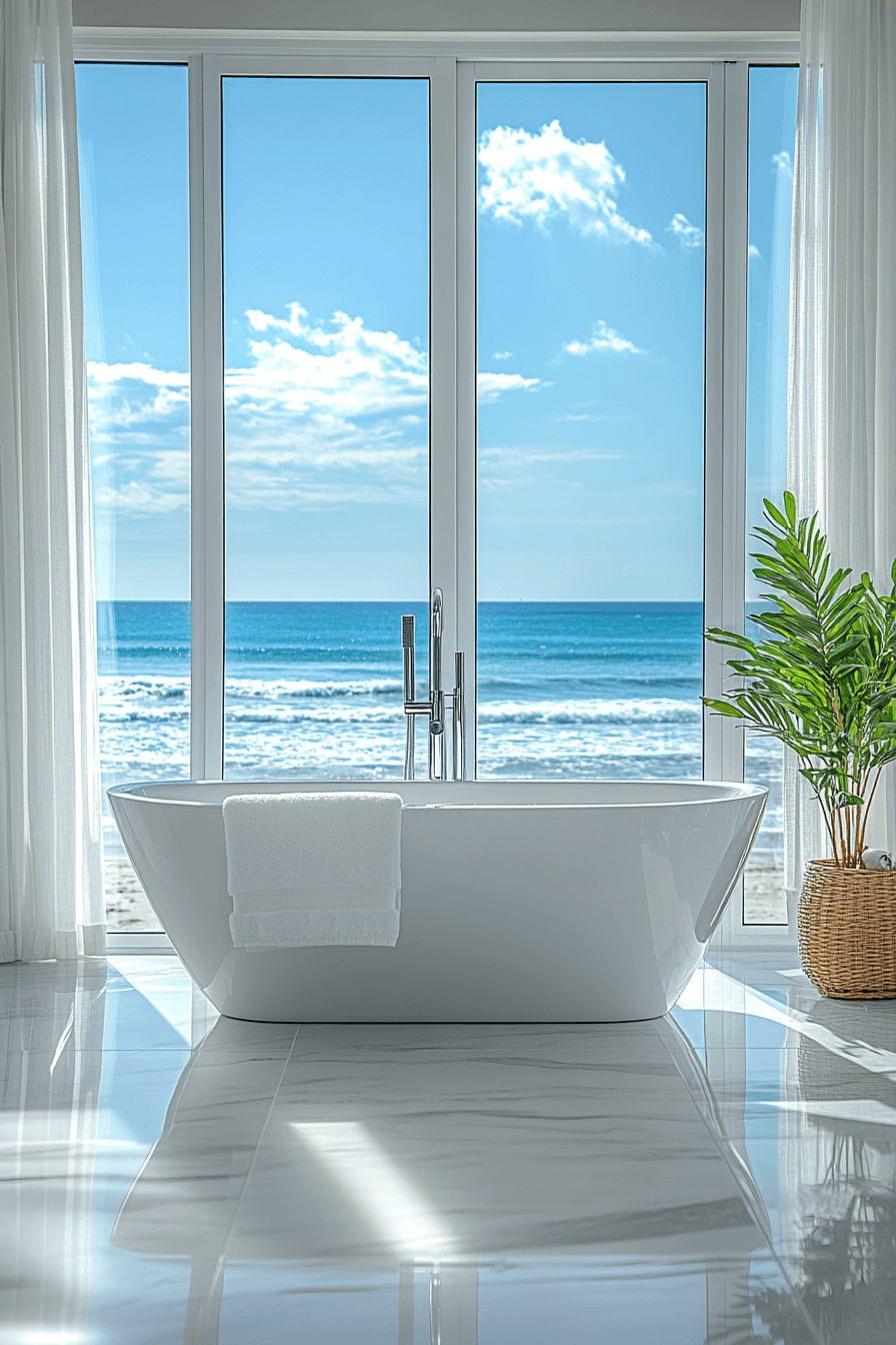 Natural light defines this open and refreshing beach house bathroom, creating a strong connection to the outdoors. Bright surfaces enhance the airy feel. Clean lines keep everything modern. The space feels spacious and uplifting. The design remains simple and intentional. Let your bathroom glow with natural light and coastal charm.