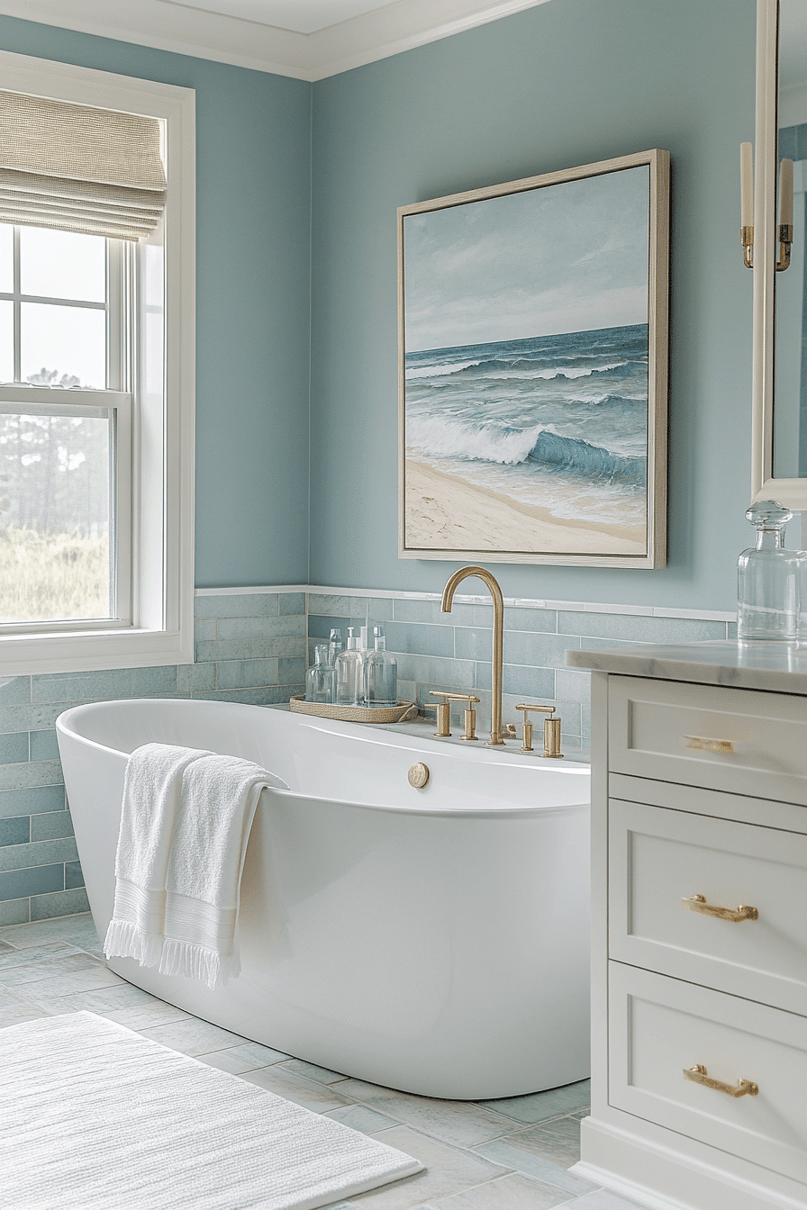 Softly blended tones create a calming flow throughout this beach house bathroom. Gentle blues and neutrals transition seamlessly across the space. Subtle textures add interest without clutter. The design feels balanced and peaceful. Every detail contributes to the relaxed atmosphere. Recreate this soothing palette and enjoy a serene environment.