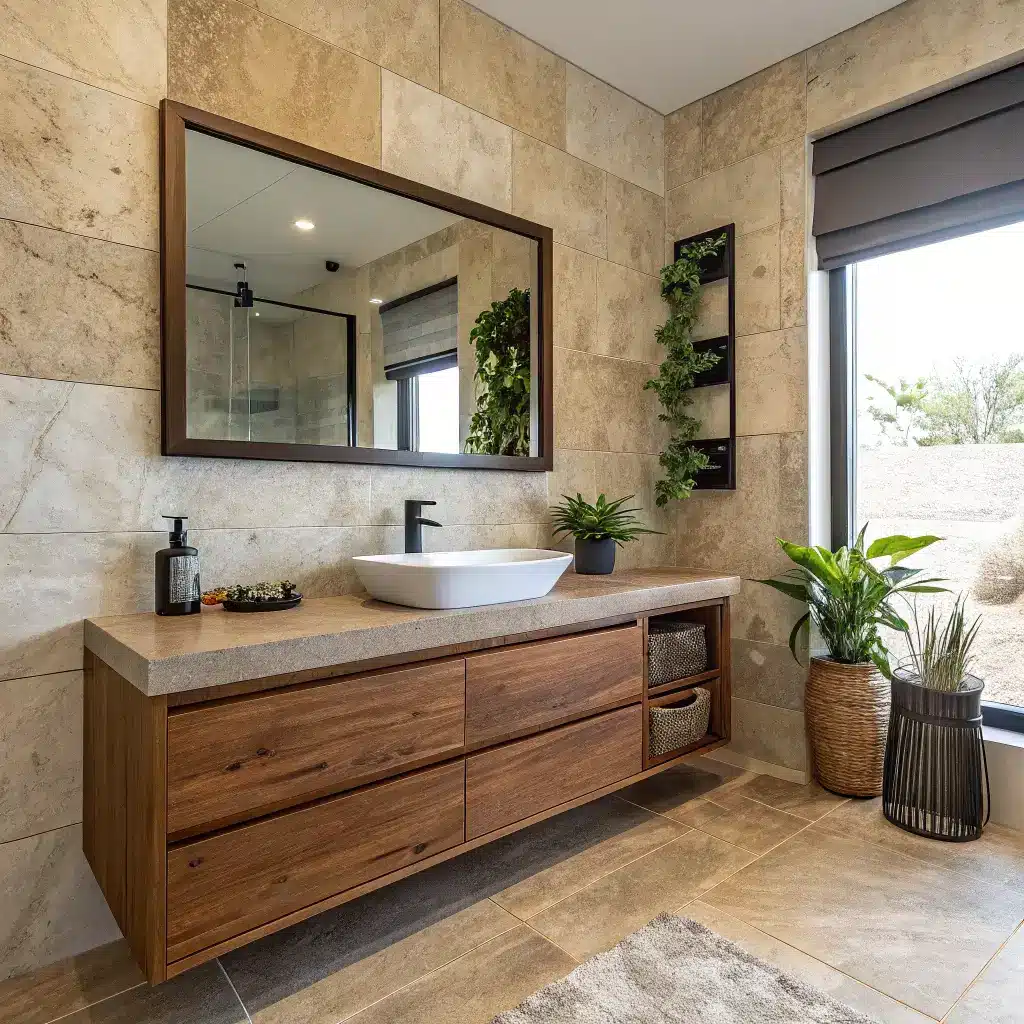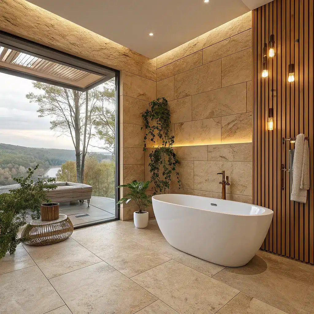 Transform your bathroom into a spa-like sanctuary with beige travertine tiles, wooden accents, freestanding tubs, and soft lighting.