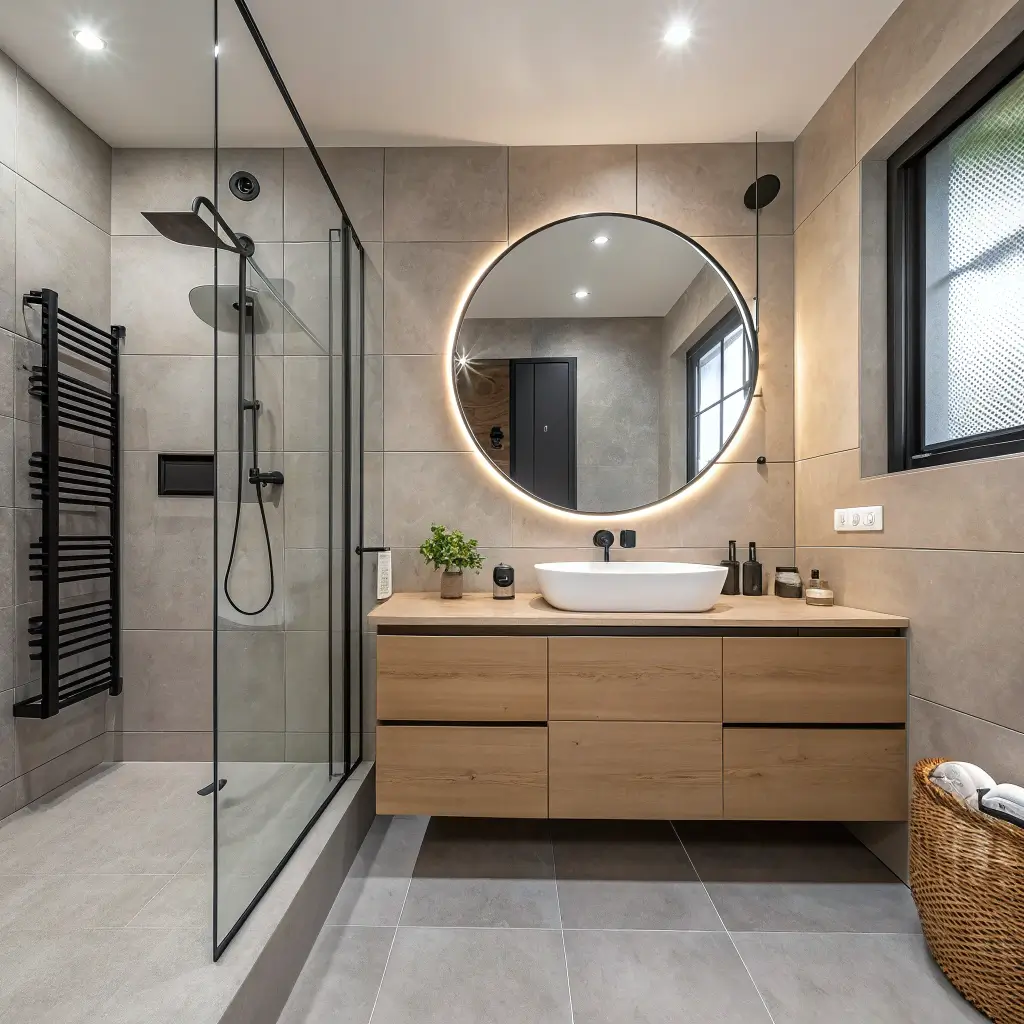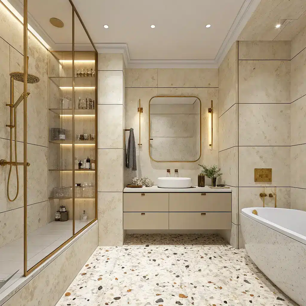 If you’re into minimalism, a modern beige bathroom is sophisticated without being stuffy. Large-format tiles, floating vanities, matte black fixtures, and frameless glass showers define the look.