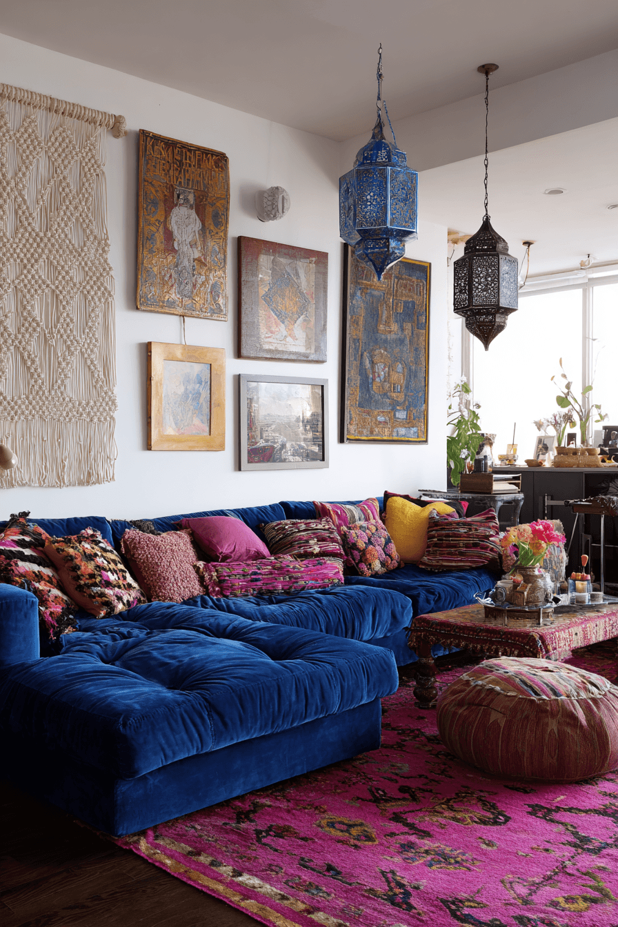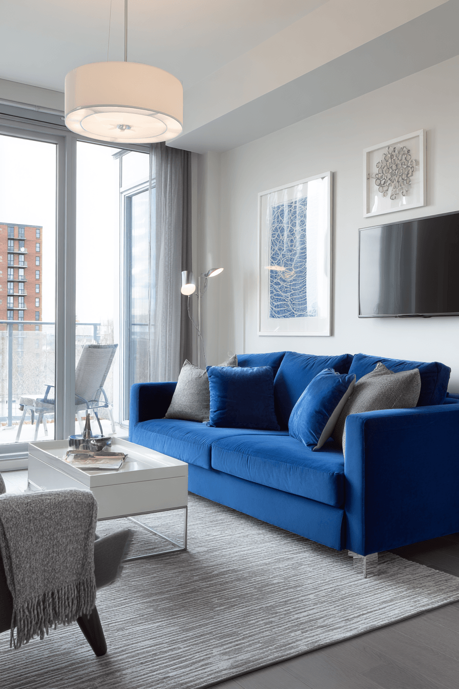 Rich saturation and smooth textures turn a blue couch living room into a visually stunning focal point. A vibrant sofa draws the eye and defines the entire layout. Keeping surrounding decor simple allows the color to shine fully. Metallic accents introduce a refined, modern touch. The balance feels both bold and sophisticated. Elevate your blue couch living room with this standout style.