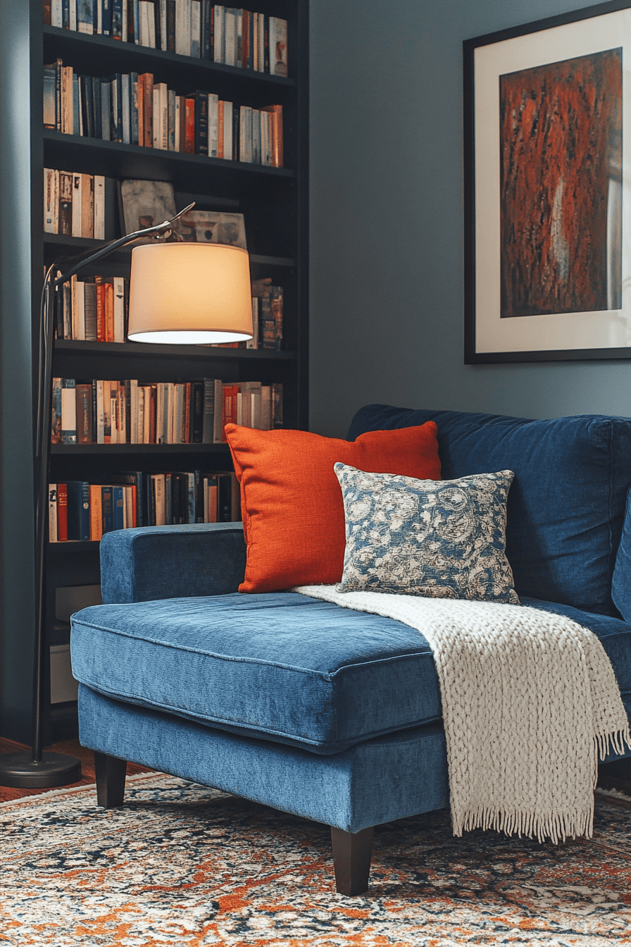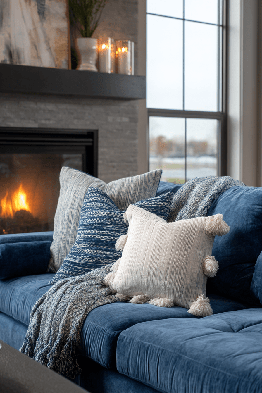 Seasonal layers bring warmth and coziness into a blue couch living room during cooler months. Thick fabrics and soft lighting create a snug atmosphere. The blue tones balance beautifully with warm accents. The space feels inviting and comforting. It’s perfect for quiet evenings. Add these layers and enjoy your blue couch living room all season.