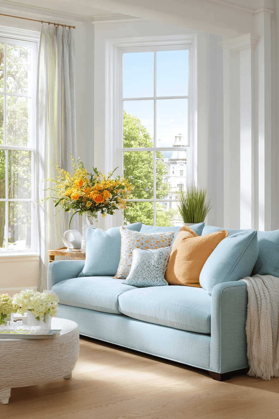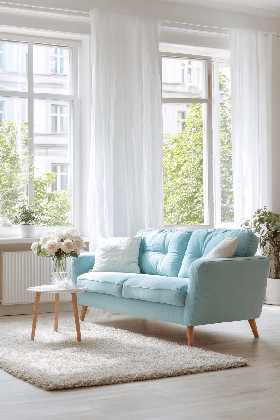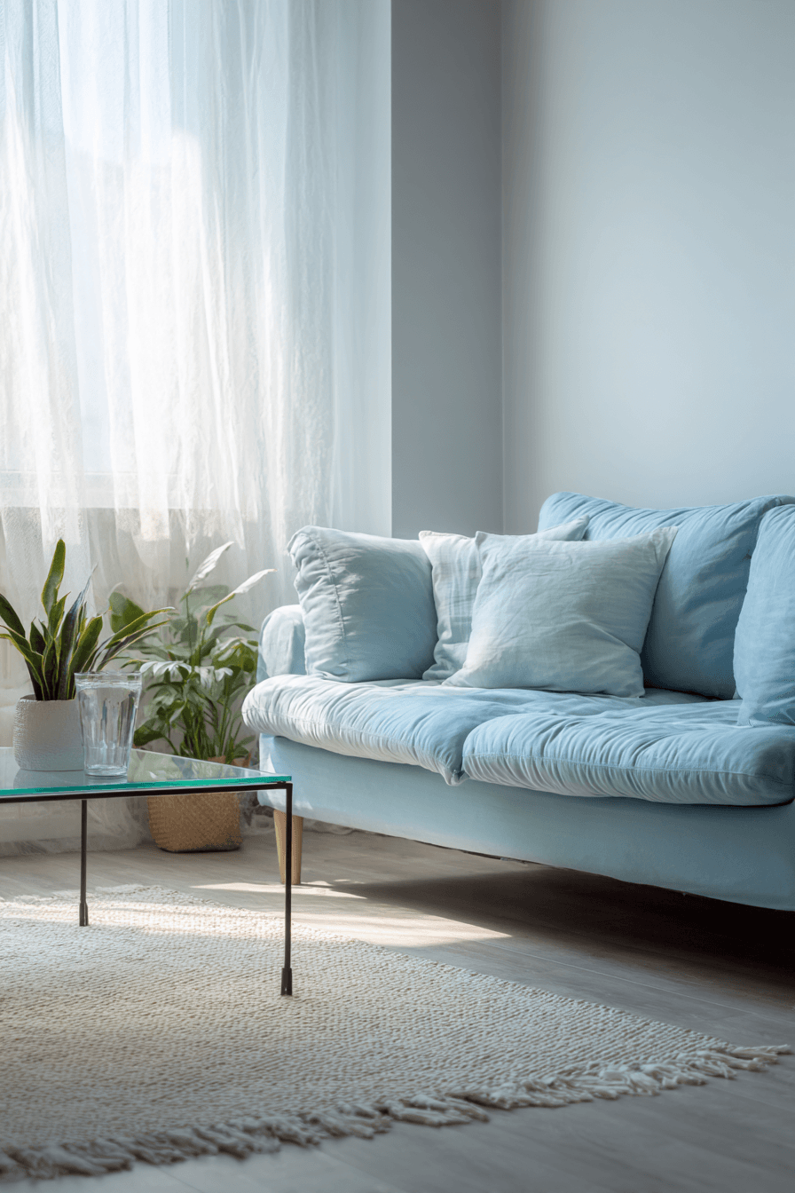 Sunlight pouring in brings a fresh glow to a blue couch living room that feels open and uplifting. A soft blue sofa reflects light and brightens the space naturally. White tones enhance the airy feel throughout. Minimal furniture keeps everything balanced. The room feels light and refreshing all day long. Brighten your blue couch living room and enjoy the glow.
