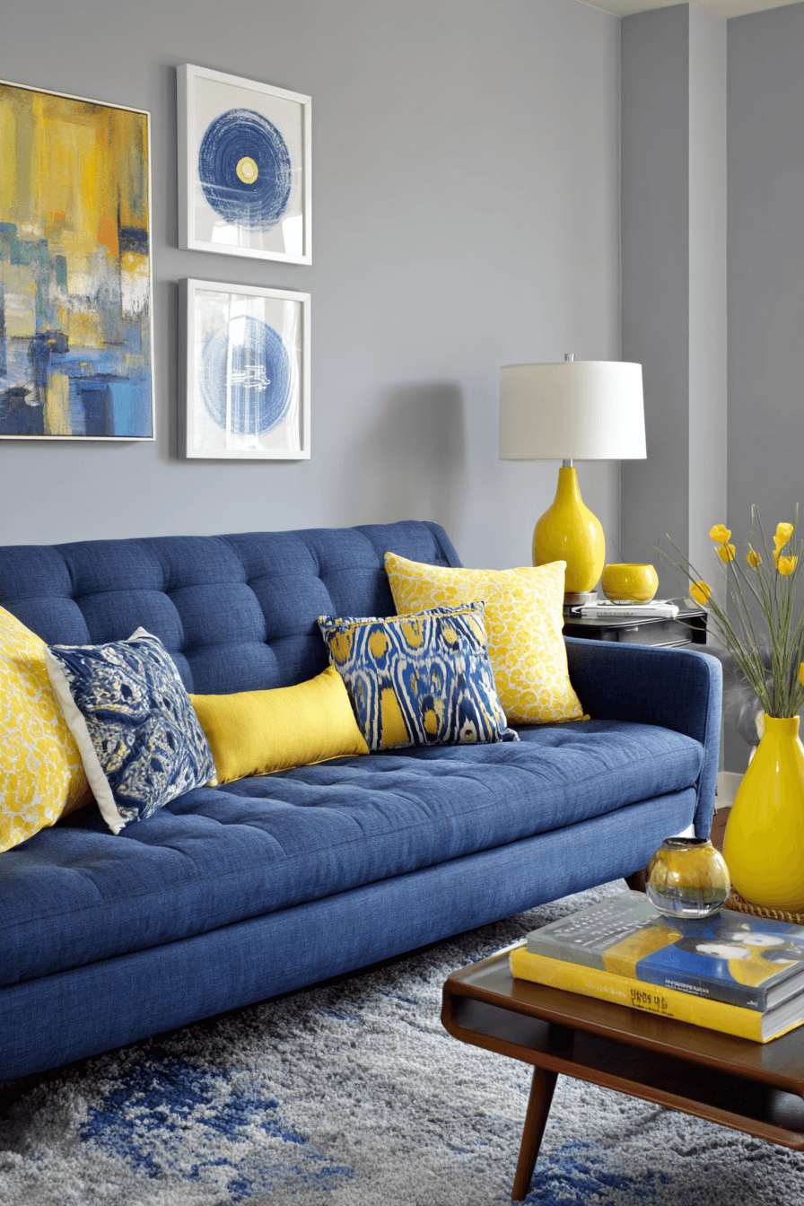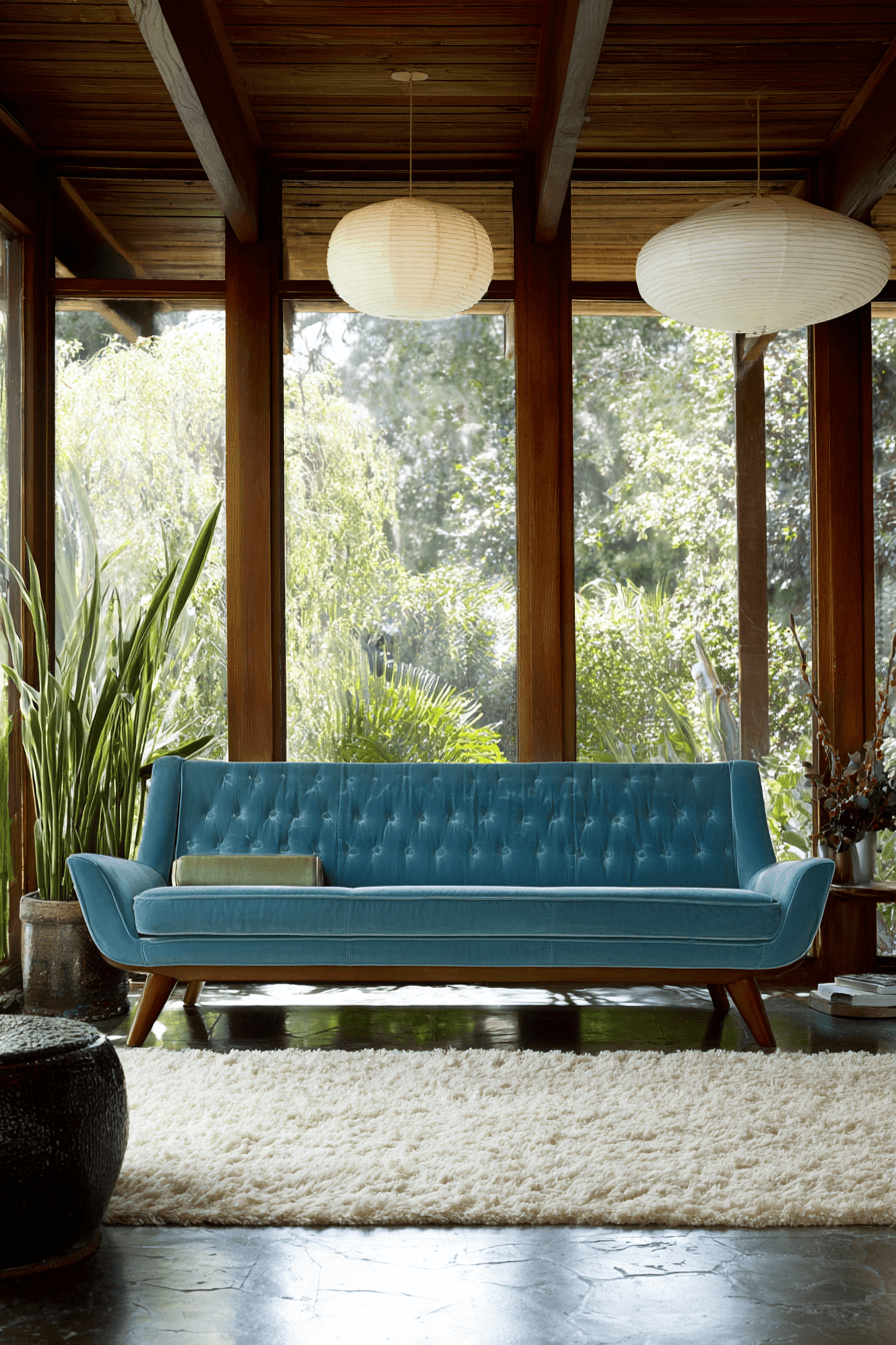 Mid-century elements give a blue couch living room a timeless yet modern appeal. Clean lines and wood tones create balance. The blue sofa adds a fresh twist to the style. The space feels both classic and current. It’s effortlessly stylish. Bring mid-century charm into your blue couch living room.