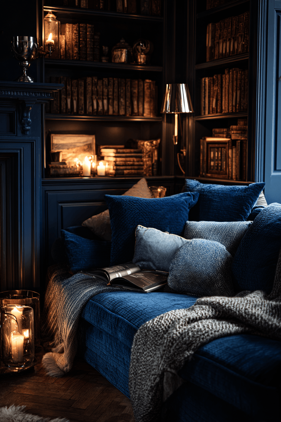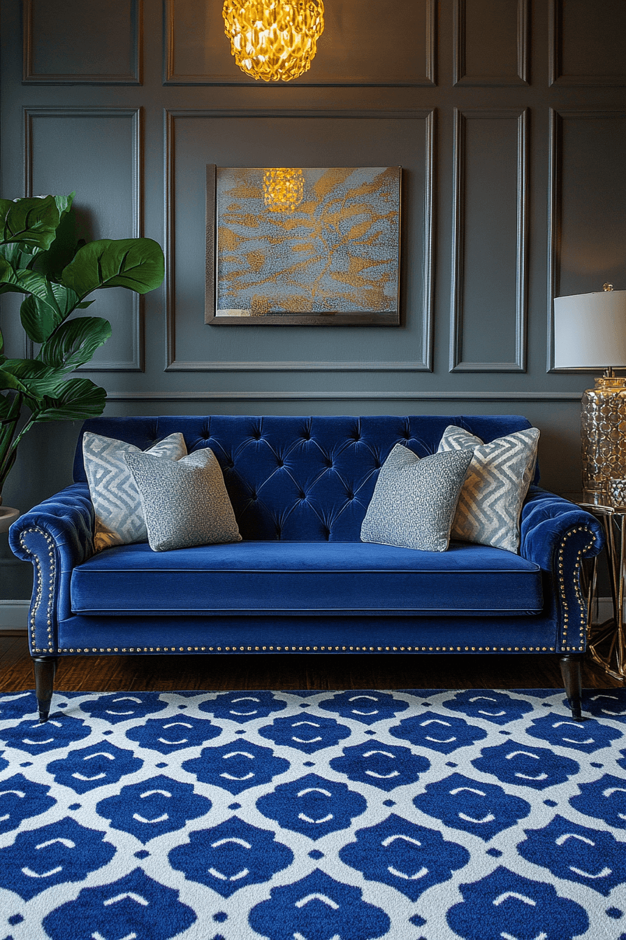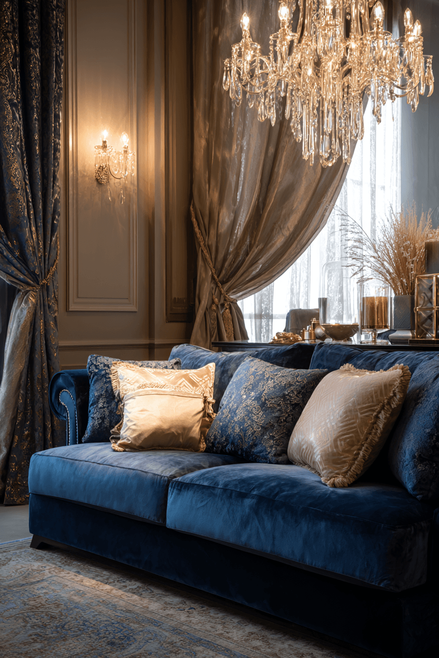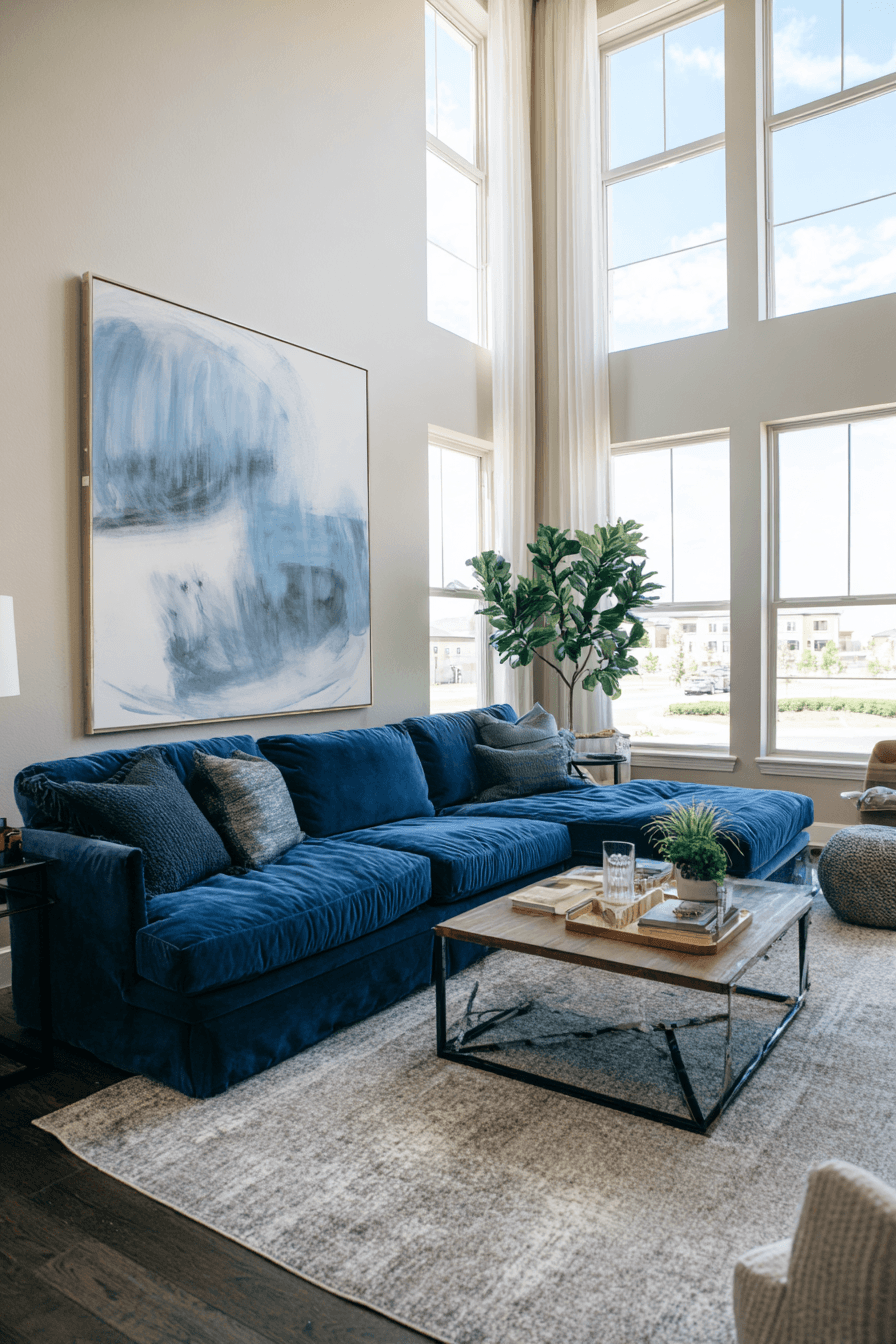Deep velvet textures instantly elevate a blue couch living room with a luxurious and cozy feel. Rich tones combined with soft finishes create a warm atmosphere. Metallic accents enhance the depth of the color. Statement lighting adds drama without overwhelming the space. The design feels both indulgent and inviting. Transform your blue couch living room with this luxe look.