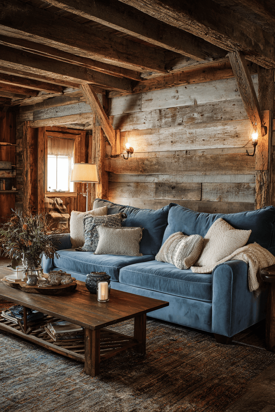 Earthy textures create a grounded and inviting blue couch living room full of warmth. Wood and natural materials balance the richness of blue tones. The design feels authentic and relaxed. Minimal decor keeps everything cohesive. The overall look is cozy and approachable. Bring this rustic warmth into your blue couch living room.