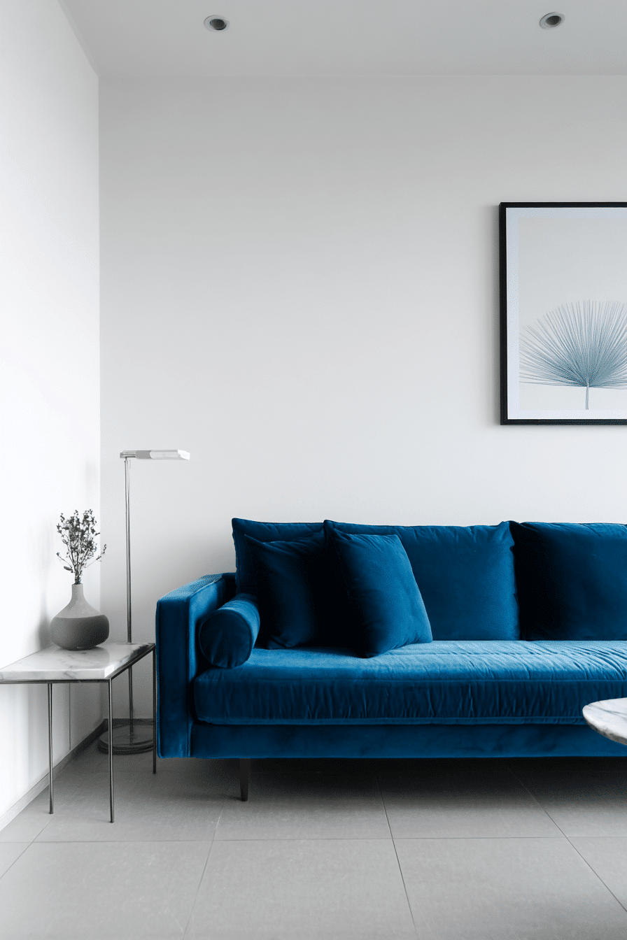 A deep navy centerpiece instantly commands attention in a blue couch living room that feels bold and modern. The rich tone anchors the entire space while everything else stays clean and minimal. Neutral surroundings help the color stand out without distraction. Subtle lighting and simple decor enhance the overall calm. The result feels striking yet effortless. Let your blue couch living room lead the design and make a statement.