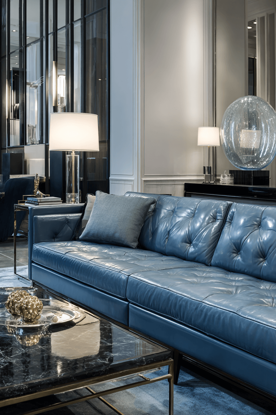 Subtle shimmer adds elegance to a blue couch living room through metallic details. Small accents bring light and sophistication. The contrast enhances the richness of blue tones. The design feels polished and refined. It’s a simple yet impactful upgrade. Add this shine to your blue couch living room today.
