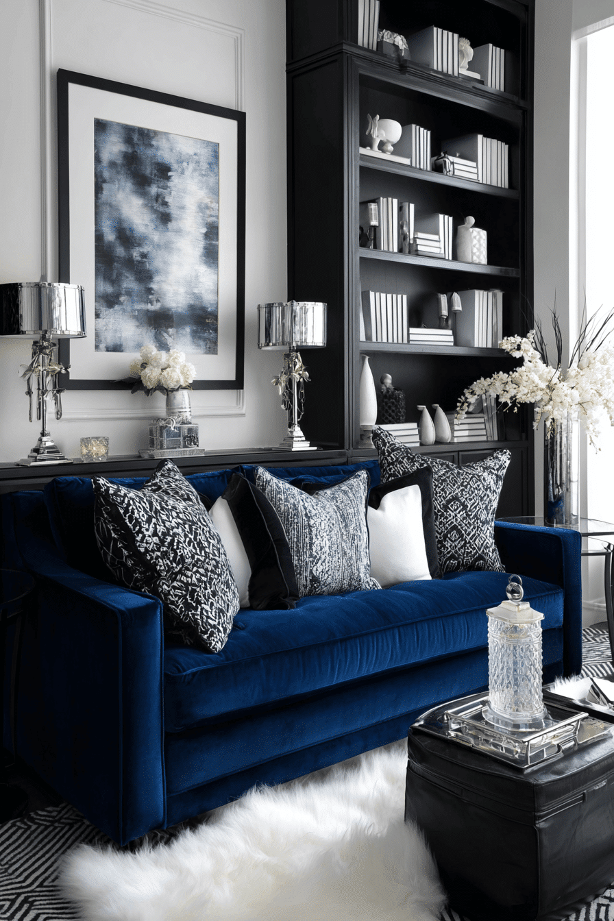 Sharp contrast creates instant drama in a blue couch living room built around bold color blocking. Deep blue paired with crisp black and white feels modern and confident. Clean lines keep the design from feeling busy. Textures add just enough depth to hold interest. The overall look feels curated and striking. Try this high-impact approach in your blue couch living room.