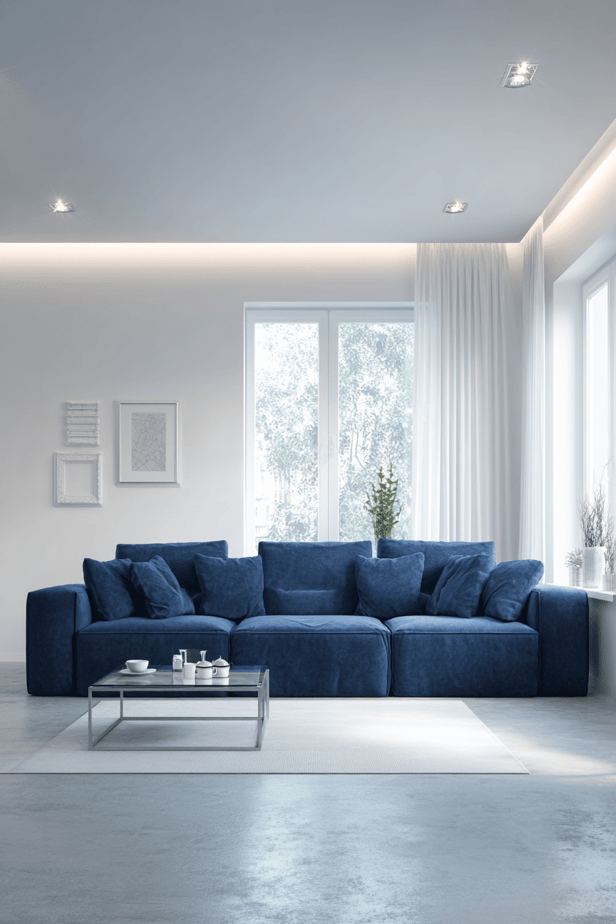 A deep navy centerpiece instantly commands attention in a blue couch living room that feels bold and modern. The rich tone anchors the entire space while everything else stays clean and minimal. Neutral surroundings help the color stand out without distraction. Subtle lighting and simple decor enhance the overall calm. The result feels striking yet effortless. Let your blue couch living room lead the design and make a statement.
