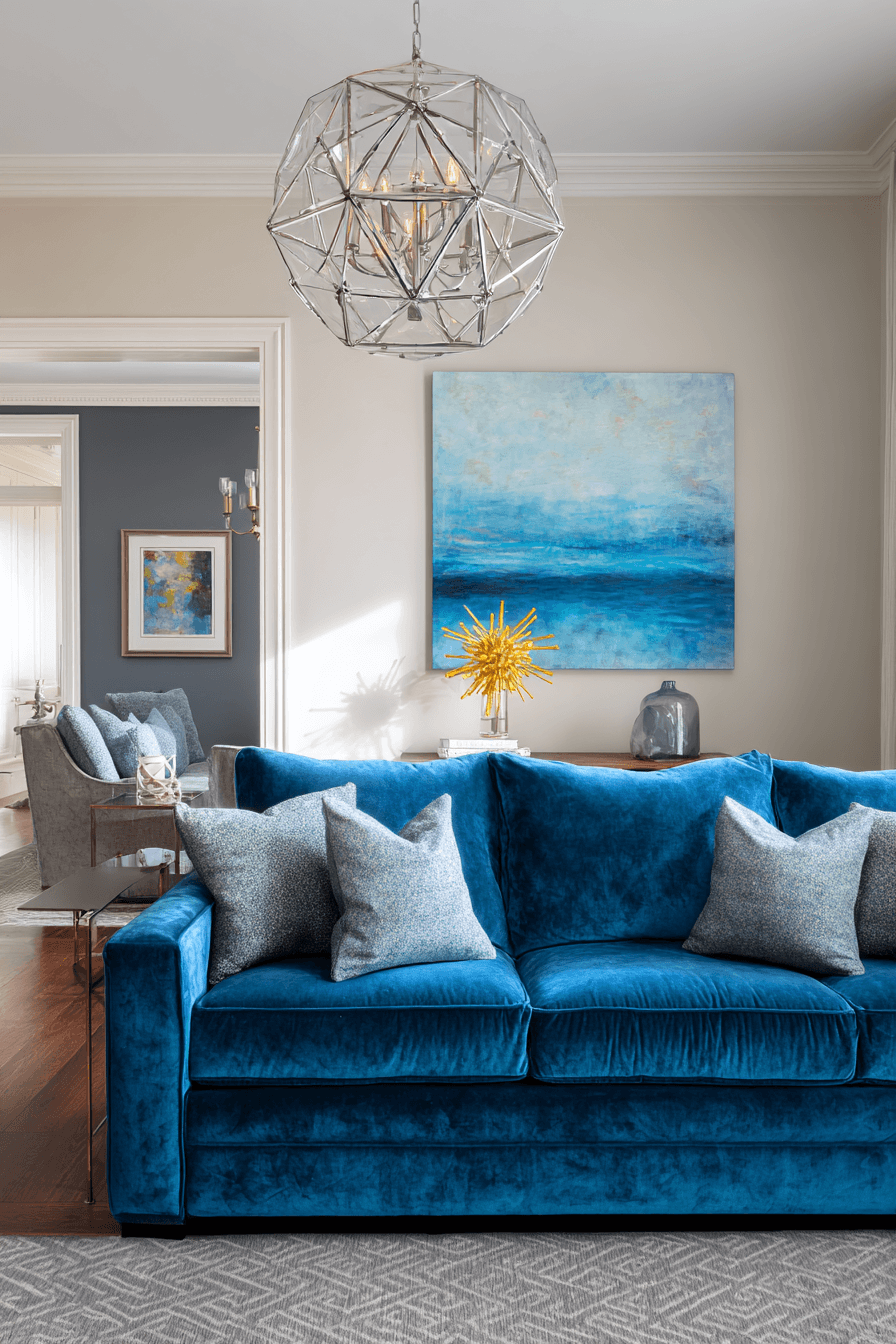 Deep velvet textures instantly elevate a blue couch living room with a luxurious and cozy feel. Rich tones combined with soft finishes create a warm atmosphere. Metallic accents enhance the depth of the color. Statement lighting adds drama without overwhelming the space. The design feels both indulgent and inviting. Transform your blue couch living room with this luxe look.